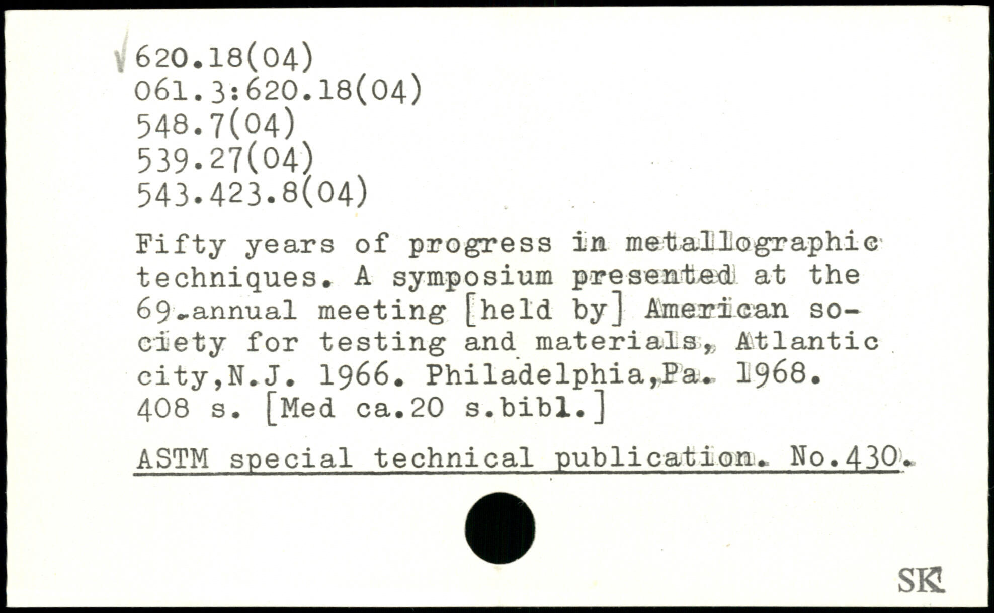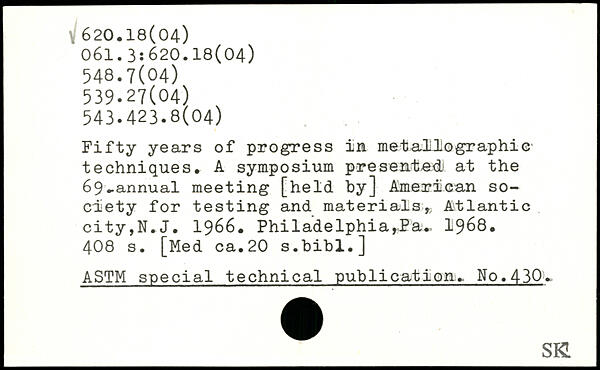 Fifty years of progress in meialilographic techniques. A symposium presented at the 69►annual meeting [held by] American society for testing and materials,, Atlantic city,N.J. 1966.