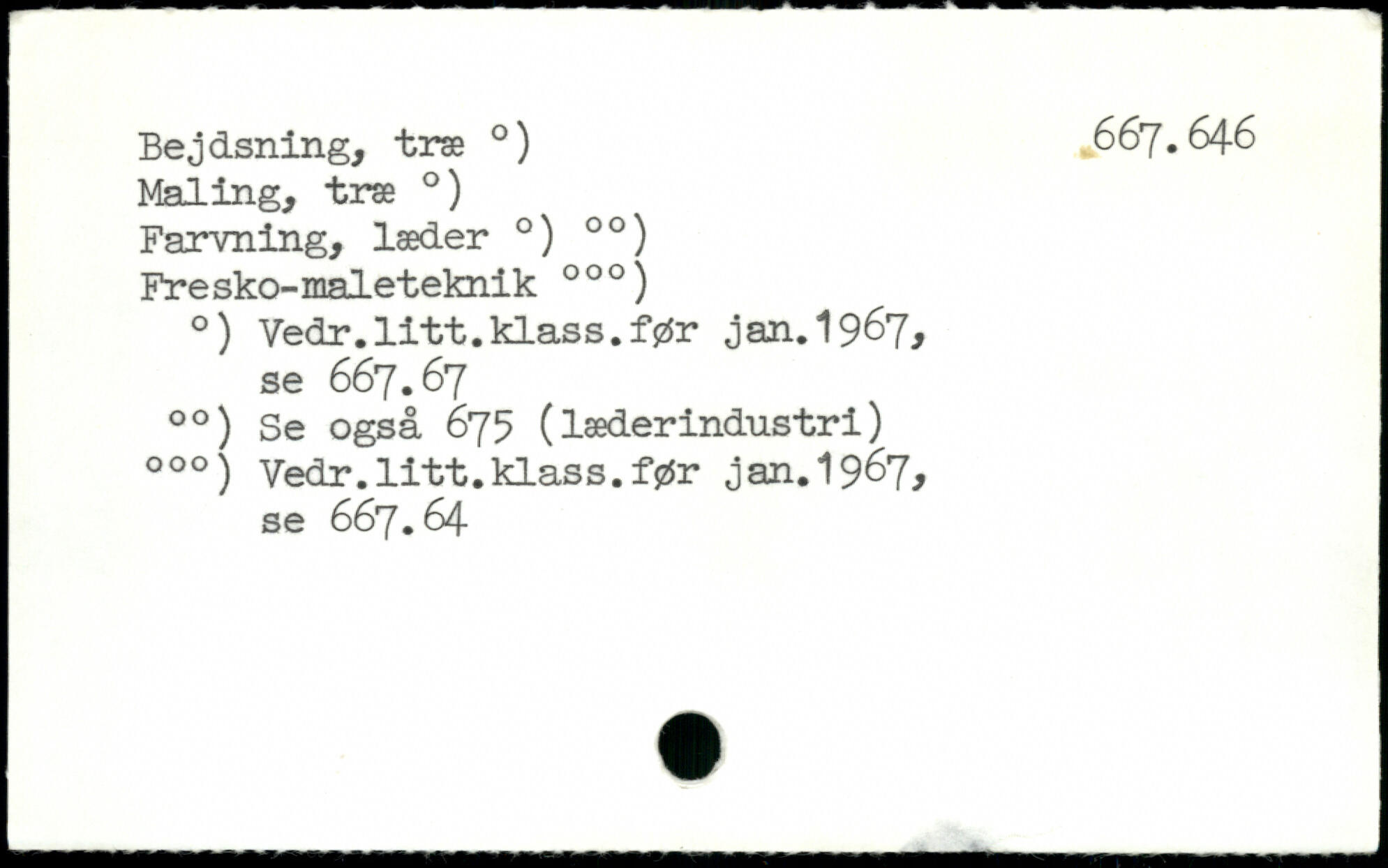 Bejdsning, træ .) 667.646 Maling, træ .) Farvning, læder .) 00) Fresko-maleteknik 000) .) Vedr.litt.klass.før jan.1967. se 667.67 00) Se også 675 (læderindustri) 000) Vedr.litt.klass.før jan.1967. se 667.64