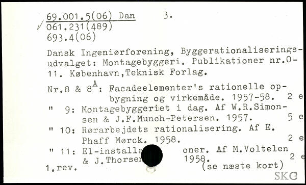Dansk Ingeniørforening, Byggerationaliseringsudvalget: Montagebyggeri. Publikationer nr.O-11. København,Teknisk Forlag. Nr.8 & 8^: Facadeelementer’s rationelle opbygning og virkemåde. 1957-58. 2 e , 9; Montagebyggeriet i dag. Af W.R.Simonsen & J.F.Munch-Petersen. 1957. 5 e " 10: Rørarbejdets rationalisering. Af E. Phaff Mørck. 1958. 2 e , El-installa^^^ oner. Af M.Voltelen & j.Thorse^W 195Q. , ,. n 2 6