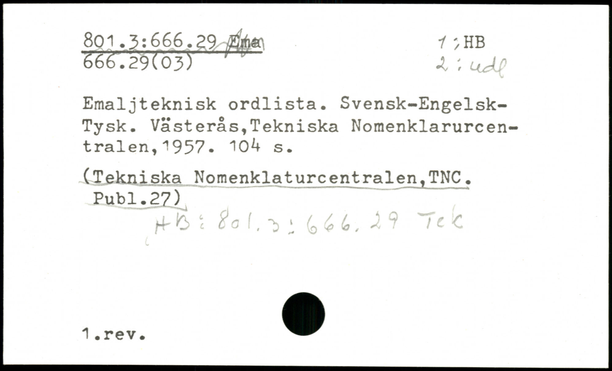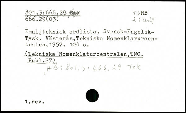 Emaljteknisk ordlista. Svensk-Engelsk-Tysk. Västerås,Tekniska Nomenklarurcen-tralen,^957.