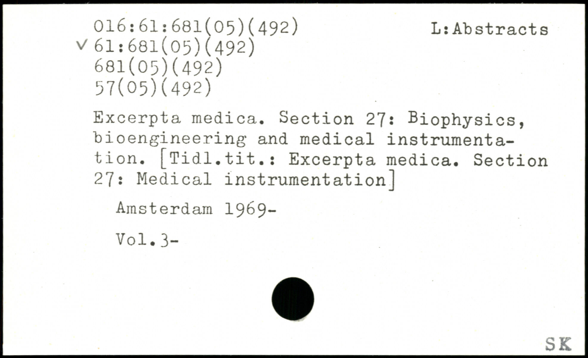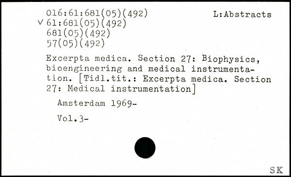 Excerpta medica. Section 27: Biophysics, bioengineering and medical instrumentation. [Tidl.tit.î Excerpta medica. Section 27: Medical instrumentation] Amsterdam 1969-