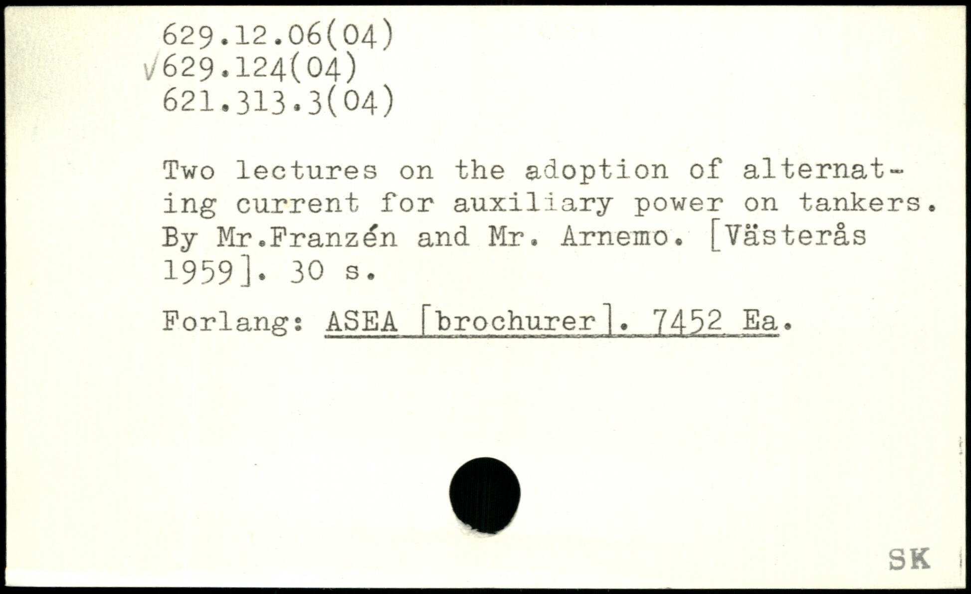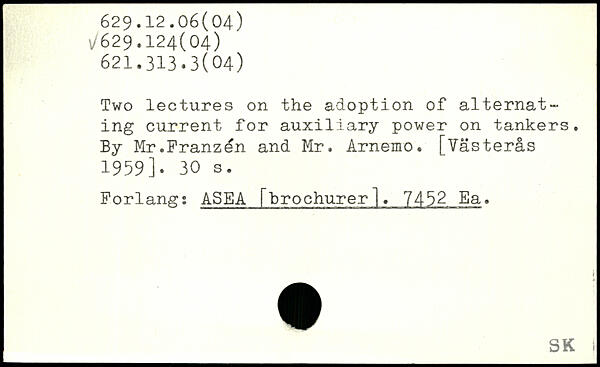 Two lectures on the adoption of alternating current for auxiliary power on tankers. By Mr.Franzén and Mr. Arnemo. [Västerås 1959].