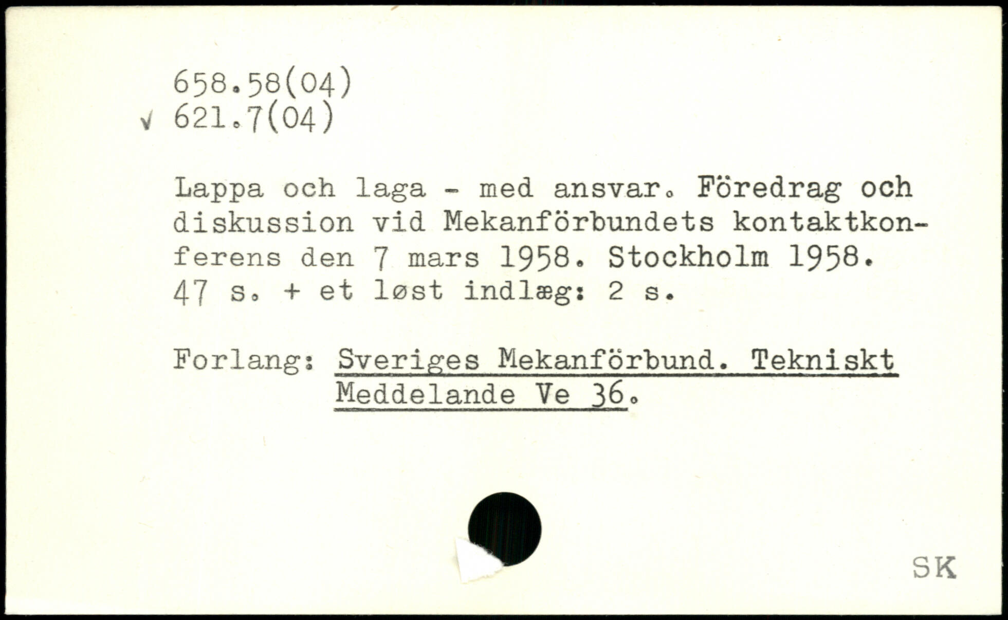 Lappa och laga - med ansvar, Föredrag och diskussion vid Mekanförbundets kontaktkonferens den 7 mars 1958