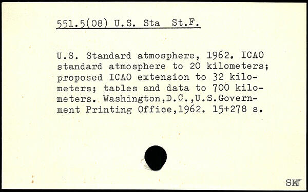 U.S. Standard atmosphere, 1962. ICAO standard atmosphere to 20 kilometers; proposed ICAO extension to 32 kilometers; tables and data to 'JOO kilometers. Washington,D.C.,U.S.Government Printing Office,1962.