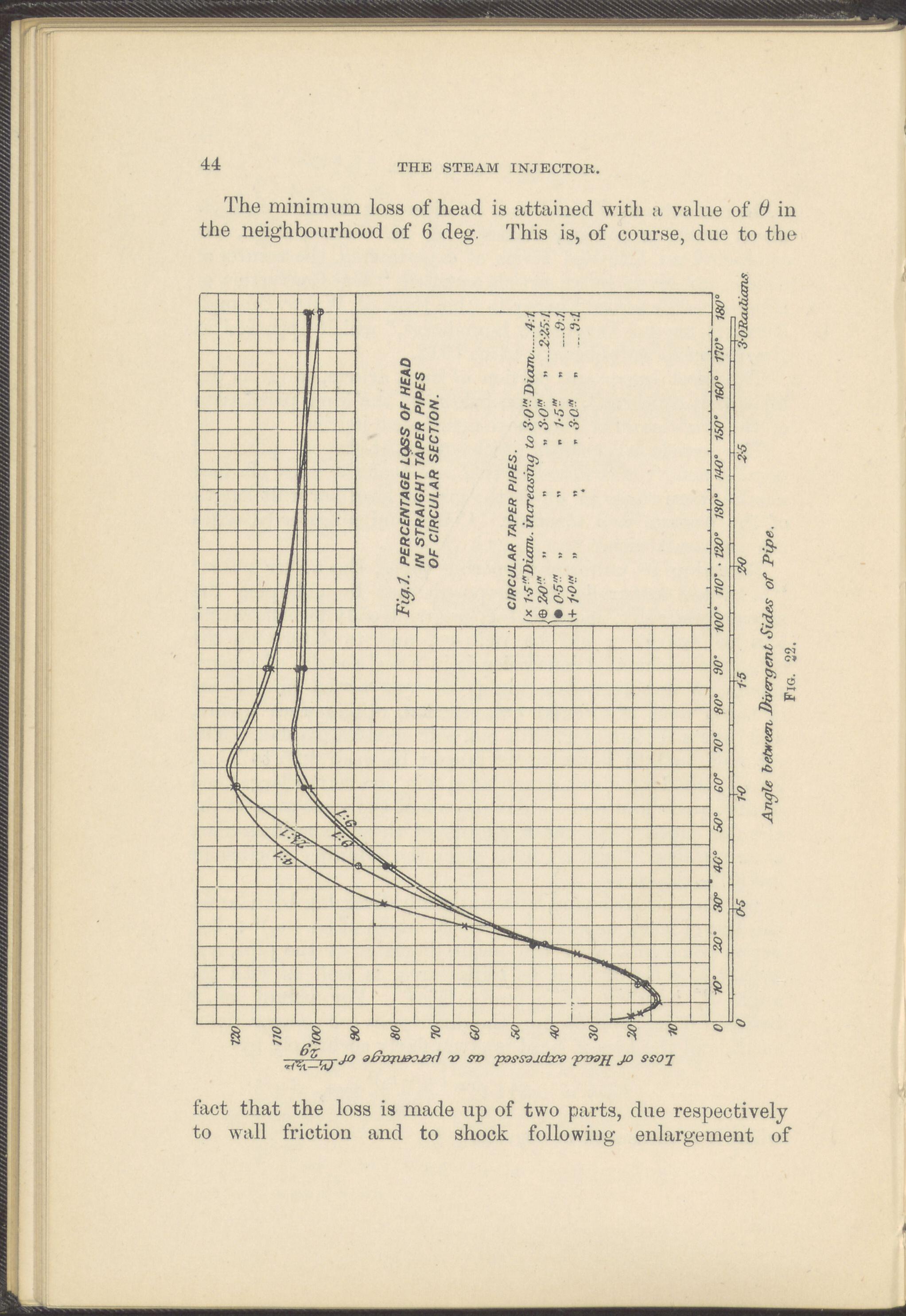44 THE STEAM INJECTOIi. The minimum loss of head is attained with a valne of 0 in the neighbourhood of 6 deg. This is, of course, due to the faet that the loss is made up of two parts, due respectively to wall friction and to shock following enlargement of