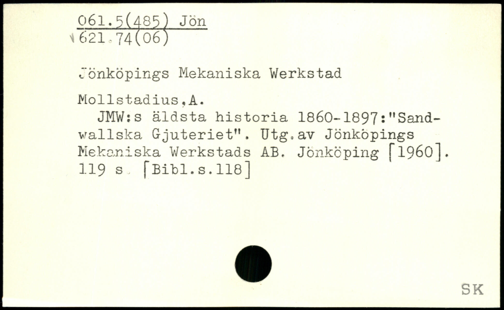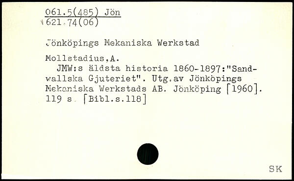 Jönköpings Mekaniska Werkstad Mollstadius,A. JMW:s äldsta historia 1860--1897. "Sand-wallska Gjuteriet". Utg.av Jönköpings Mekaniska Werkstads AB. Jönköping [1960].