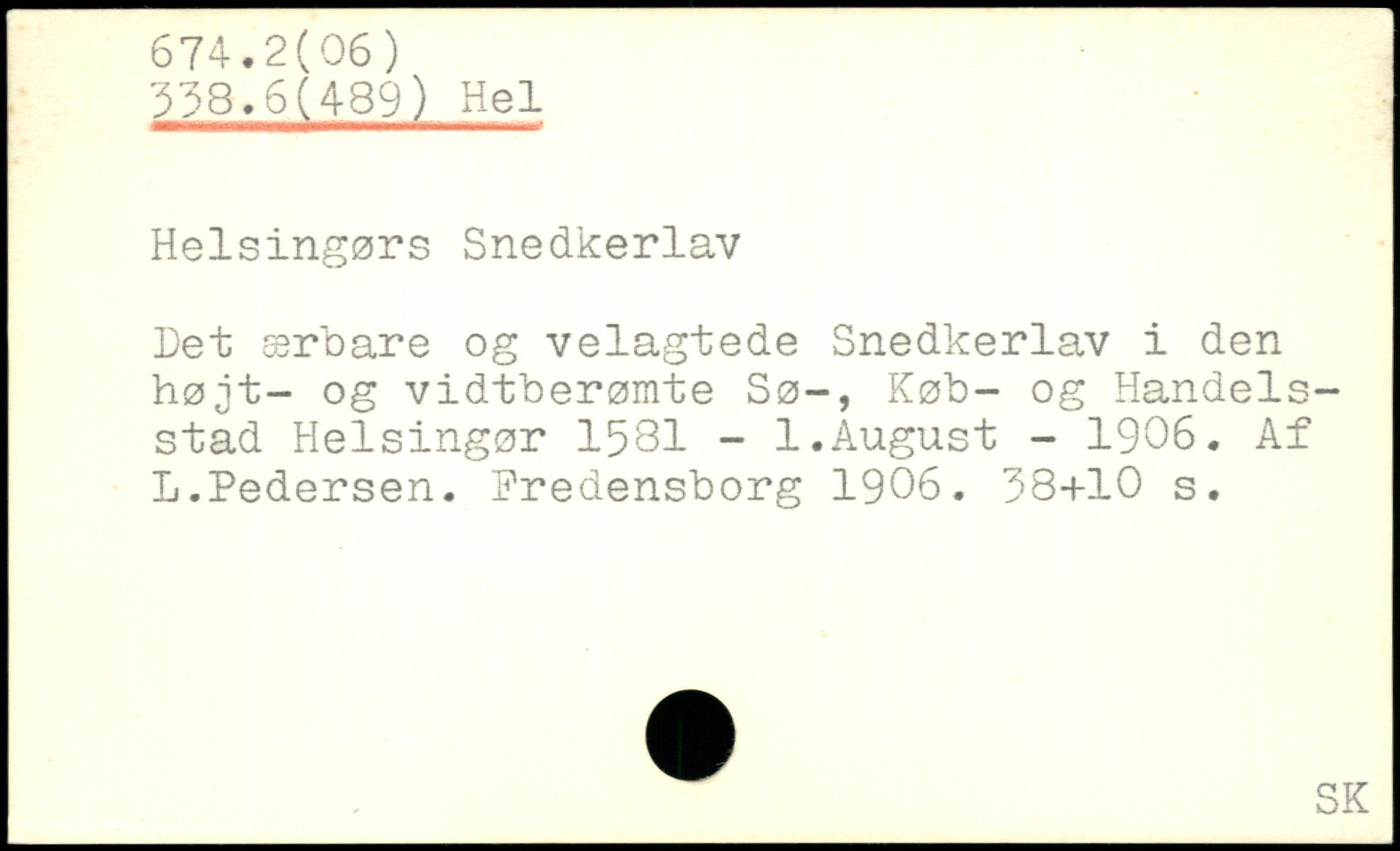 let ærbare og velagtede Snedkerlav i den højt- og vidtberømte Sø-, Køb- og Handelsstad Helsingør 1581 - 1.August - 1906. Af L.Pedersen. Fredensborg 1906.