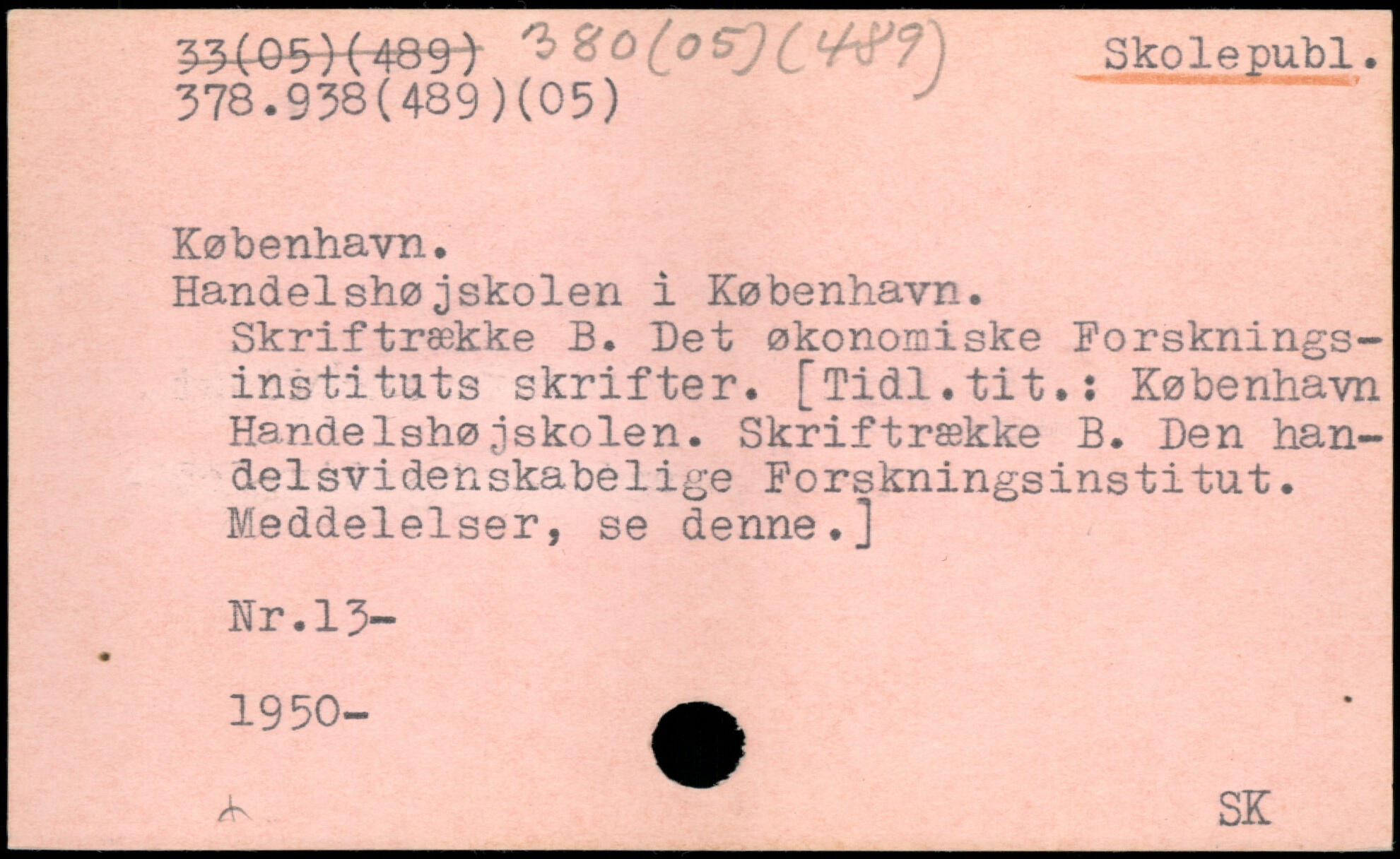Handelshøjskolen i København. Skriftrække B. Let økonomiske Forskningsinstituts skrifter. [Tidl.tit.: København Handelshøjskolen. Skriftrække B. Den handelsvidenskabelige Forskningsinstitut. Meddelelser, se denne.] Nr.13- 1950- A /K SK