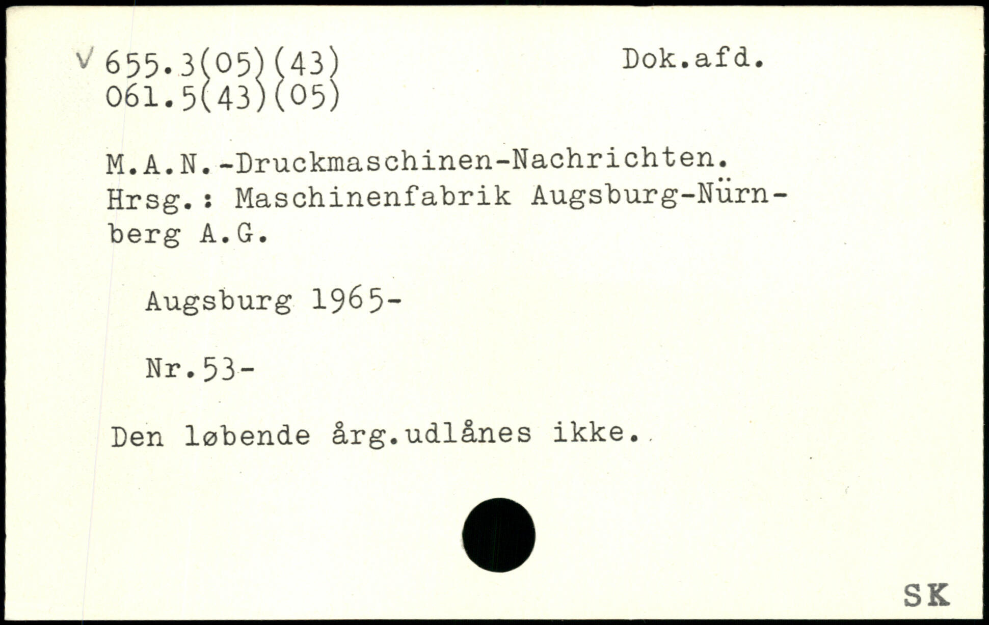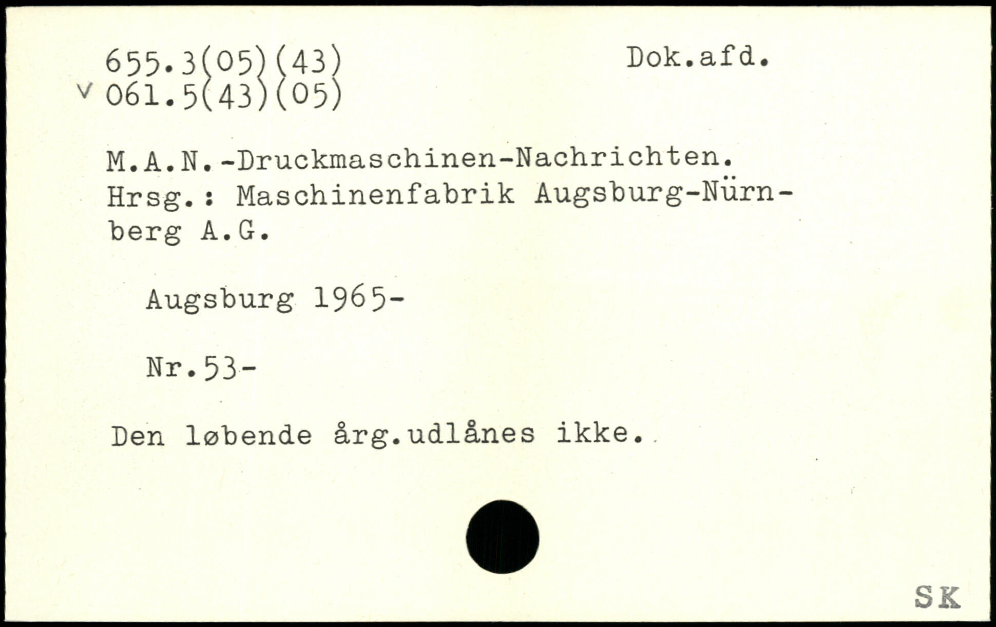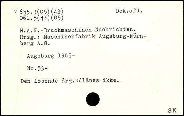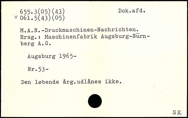 M.A.N.-Druckmaschinen-Nachrichten. Hrsg.: Maschinenfabrik Augsburg-Nürnberg A.G. Augsburg 1965- Nr.53- Den løbende årg.udlånes ikke..