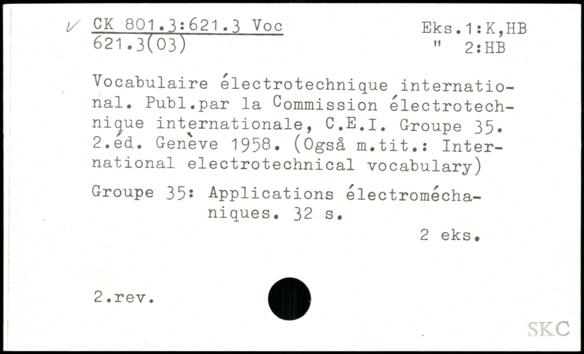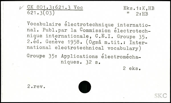 Vocabulaire électrotechnique international. Publ.par la Commission électrotechnique internationale, C.E.I. Groupe 35.