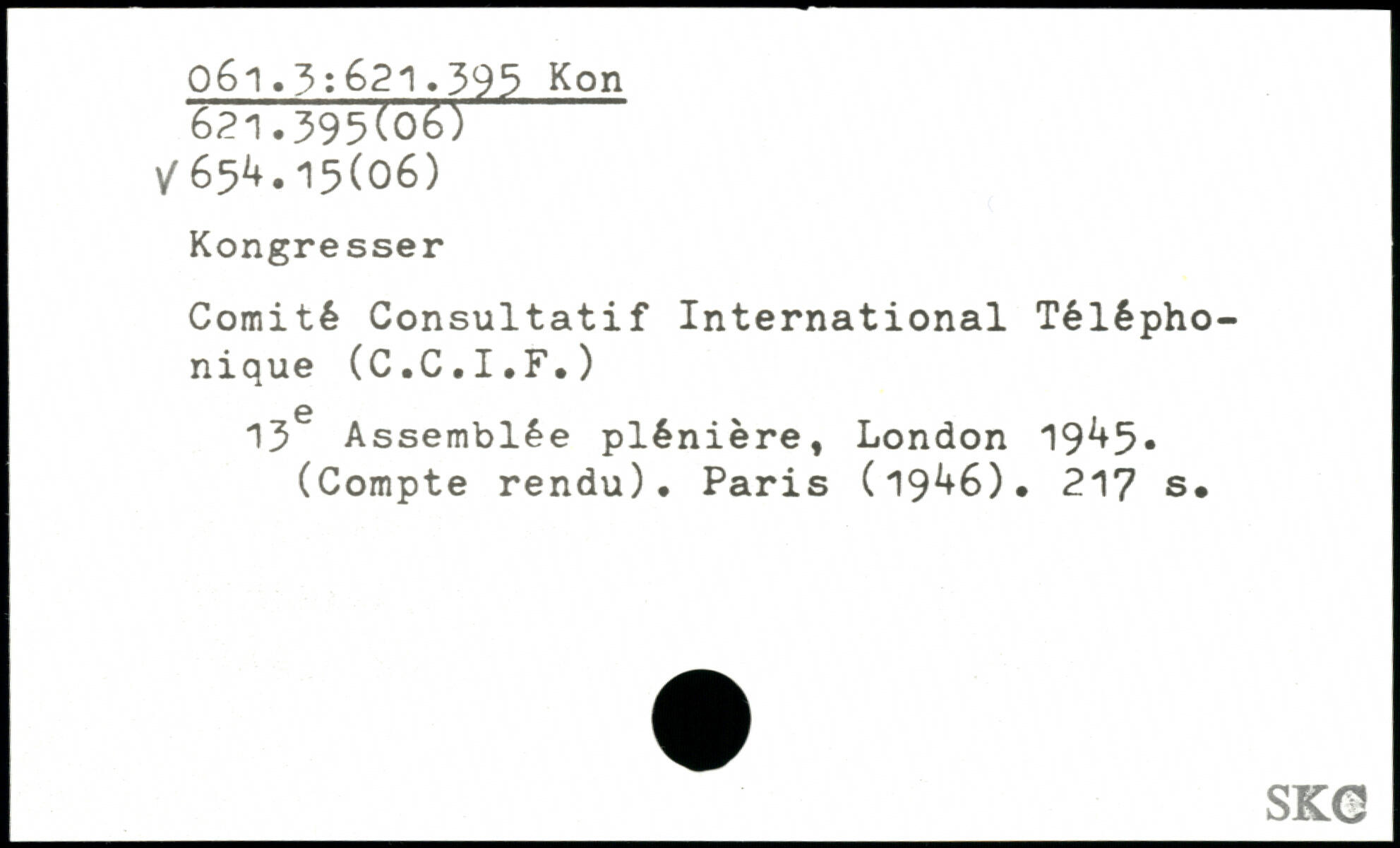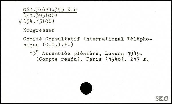 Comité Consultatif International Téléphonique (C.C.I.F.) 6 13 Assemblée plénière, London 19^+5, (Compte rendu). Paris (19^6).