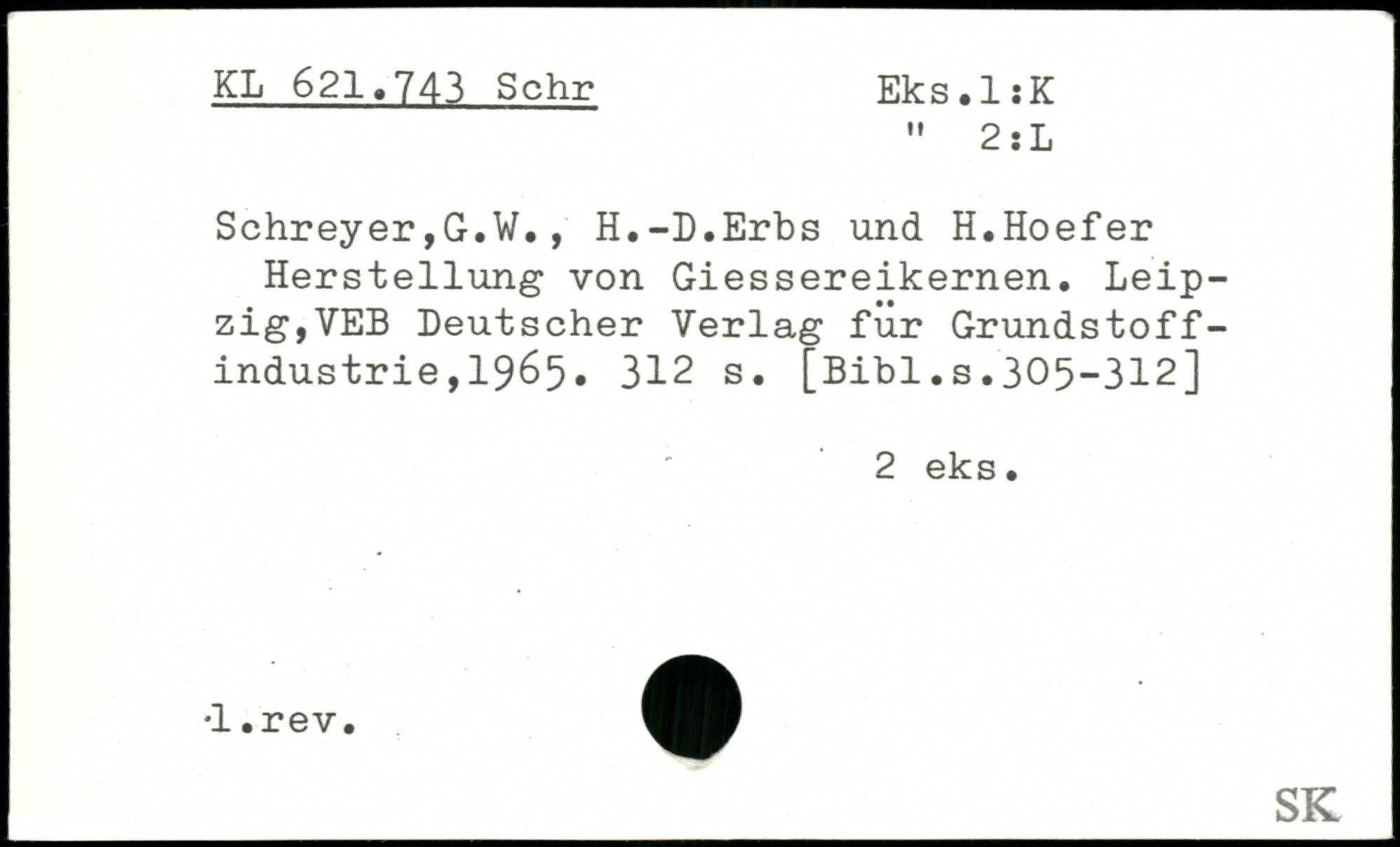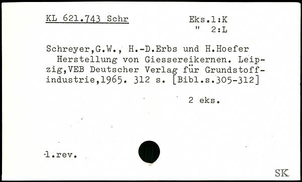 Schreyer,G.W., H.-D.Erbs und H.Hoefer Herstellung von Giessereikernen. Leipzig, VEB Deutscher Verlag für Grundstoffindustrie ,1965.