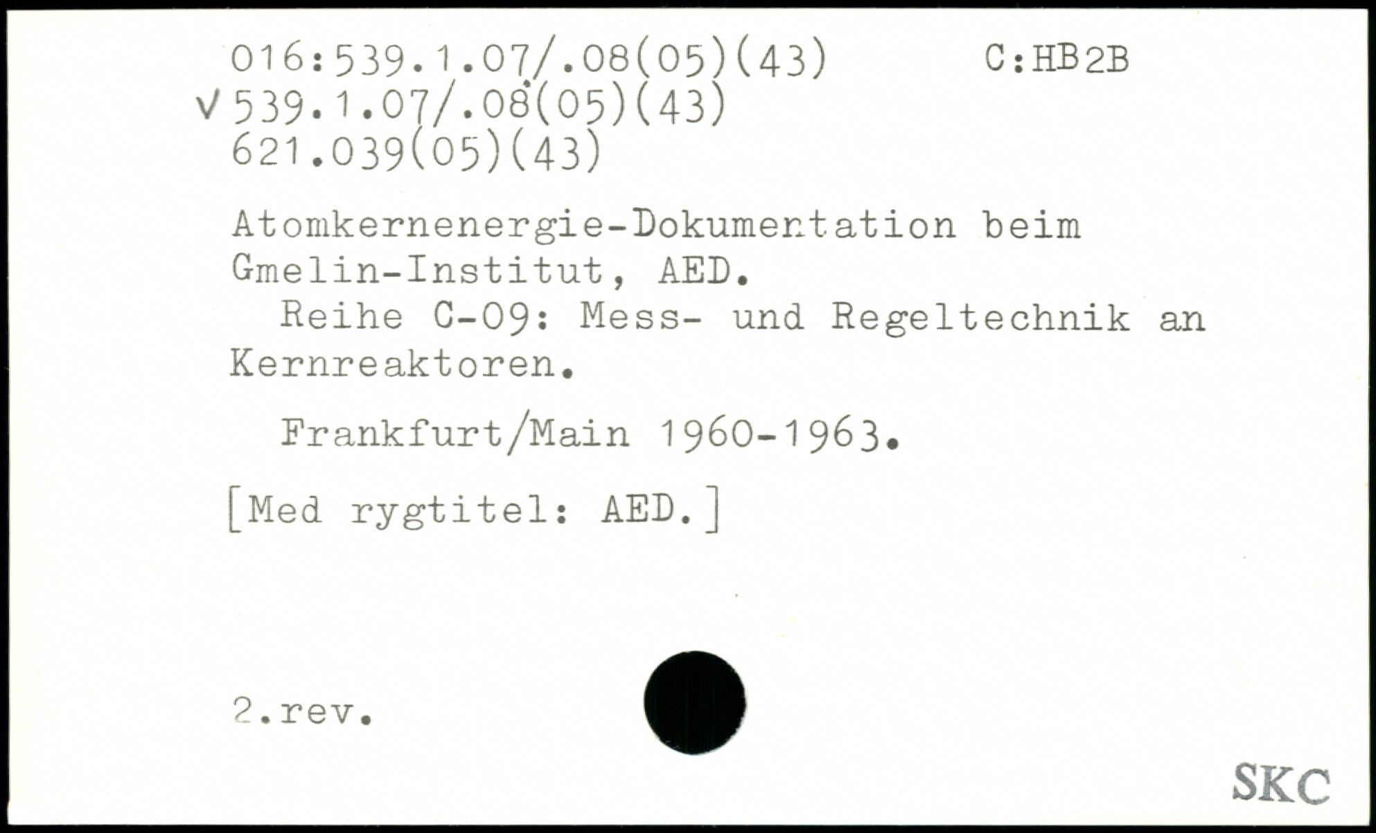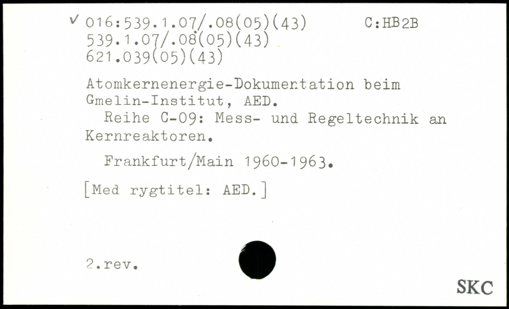 Atomkernenergie-Dokumentation beim Gmelin-Institut, AED. Reihe C-09: Mess- und Regeltechnik an Kernreaktoren. Frankfurt/Main 1960-1963,