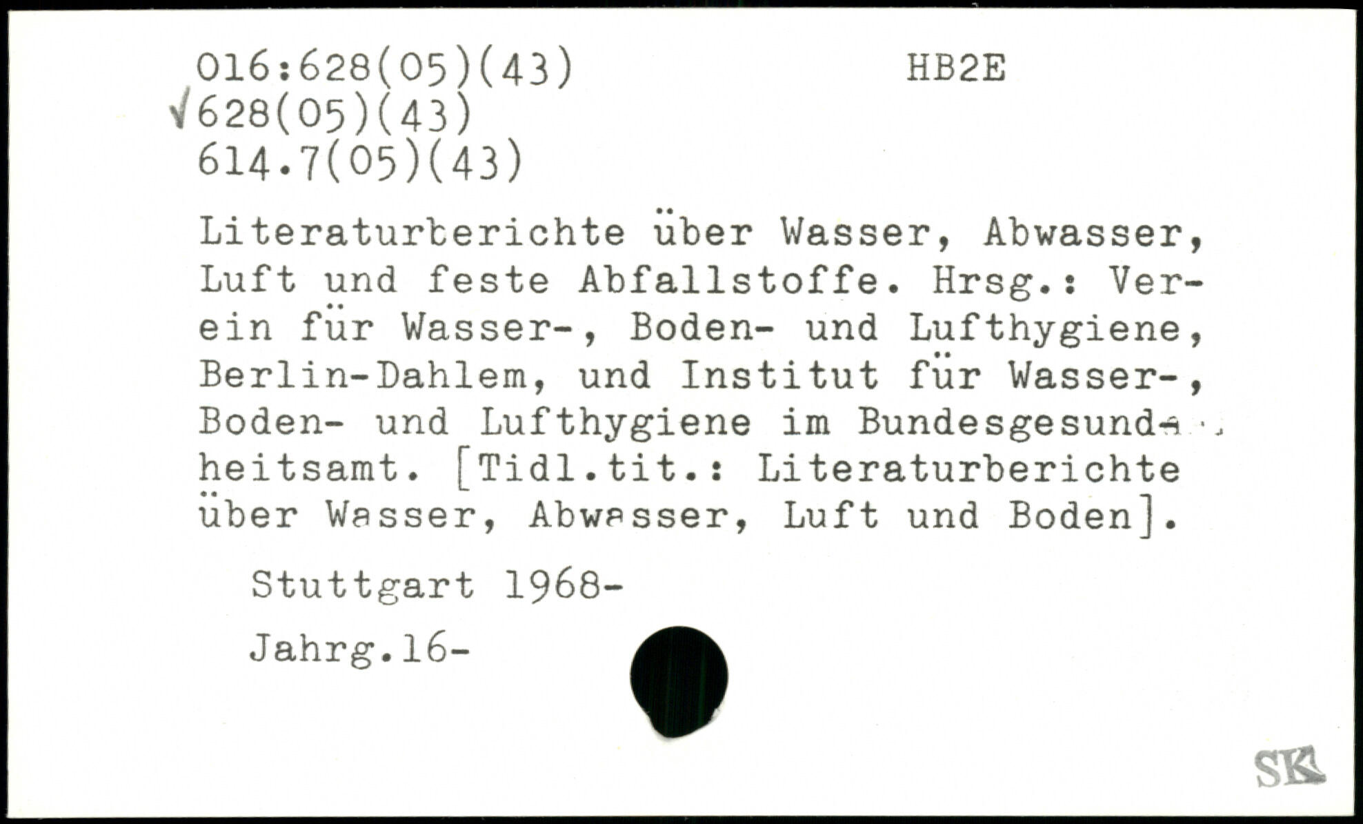 Literaturterichte über Wasser, Abwasser, Luft und feste Abfallstoffe. Hrsg.: Verein für Wasser-, Boden- und Lufthygiene, Berlin-Dahlem, und Institut für Wasser-, Boden- und Lufthygiene im Bunde sgesund-i heitsamt. [Tidl.tit.: Literaturberichte über Wasser, Abwasser, Luft und Boden].