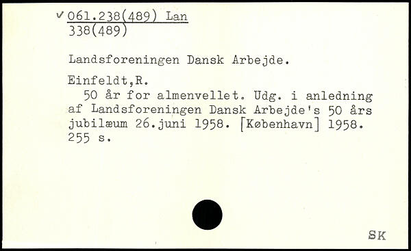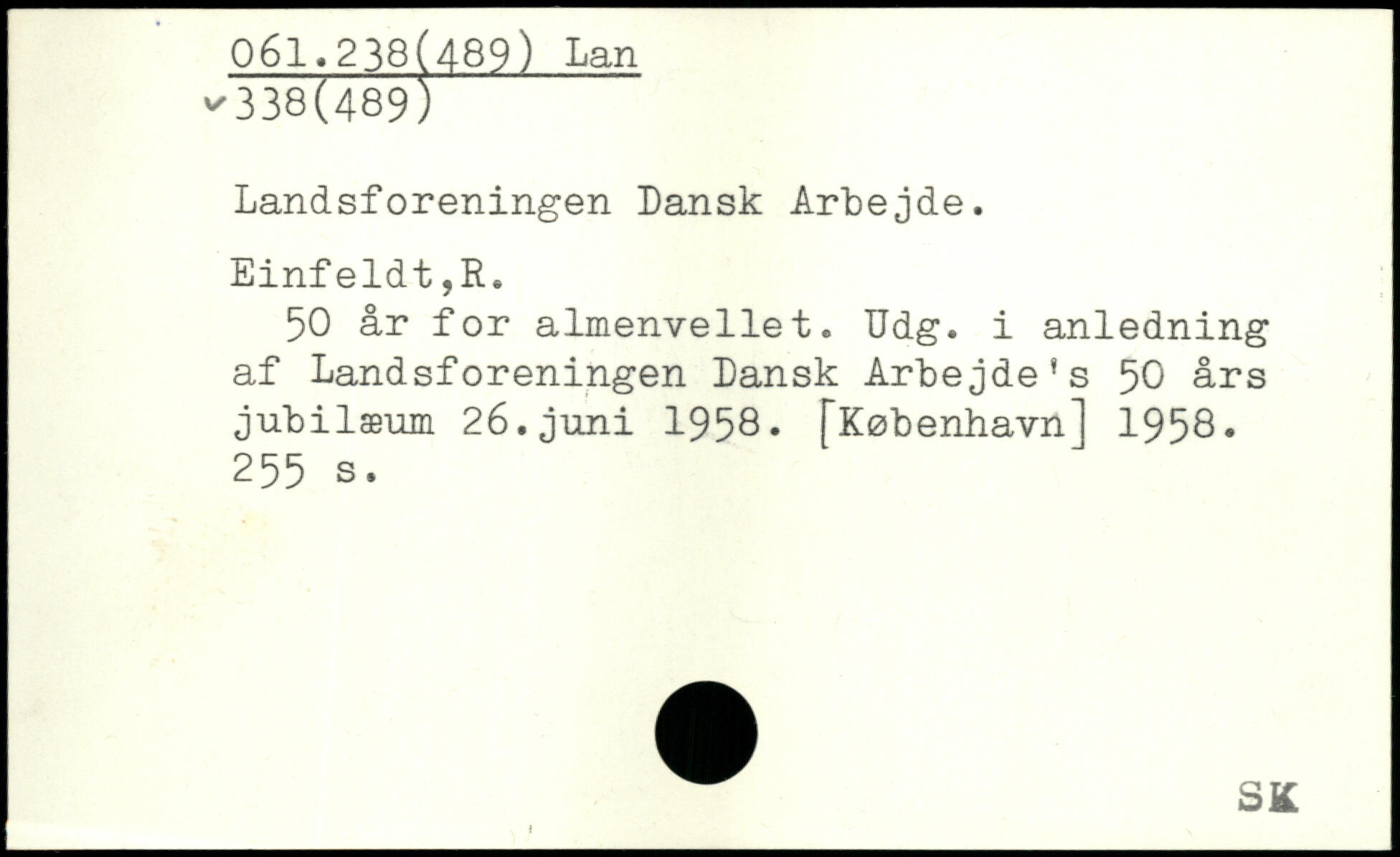 Landsforeningen Dansk Arbejde. Einfeldt,R. 50 år for almenvellet. Udg. i anledning af Landsforeningen Dansk Arbejde.s 50 års jubilæum 26.juni 1958.