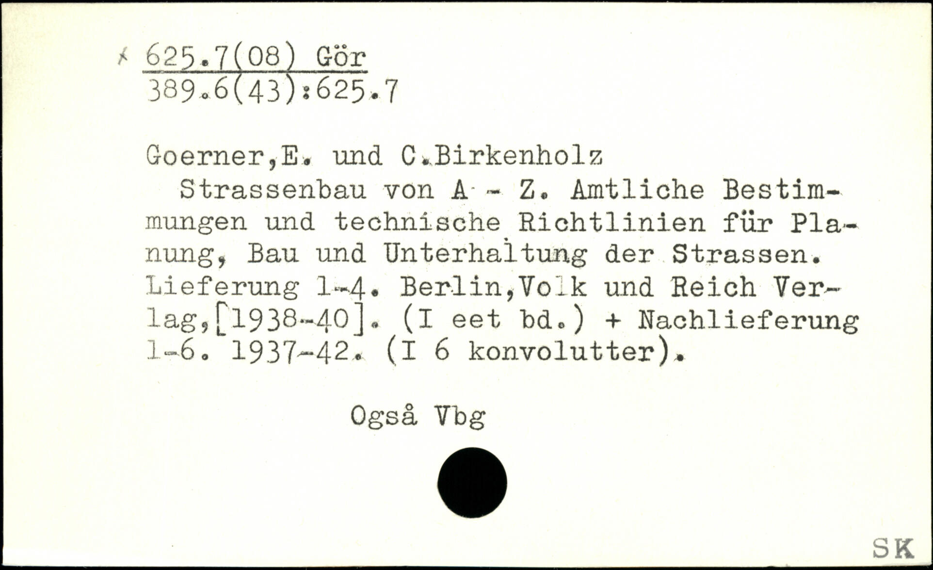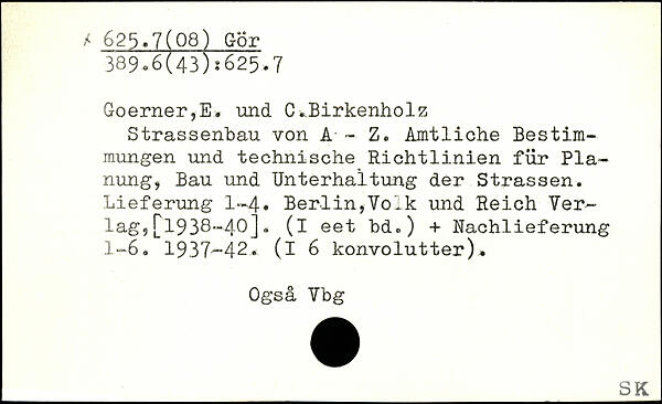 Goerner,E. und C..Birkenholz Strassenbau von A - Z. Amtliche Bestimmungen und technische Richtlinien für Planung, Bau und Unterhaltung der Strassen. Lieferung 1-4. Berlin,Volk und Reich Verlag, [1938-40]. (i eet hd.) + Nachlieferung 1-6. 1937-42. (l6 konvolütter). Ogsä Vbg
