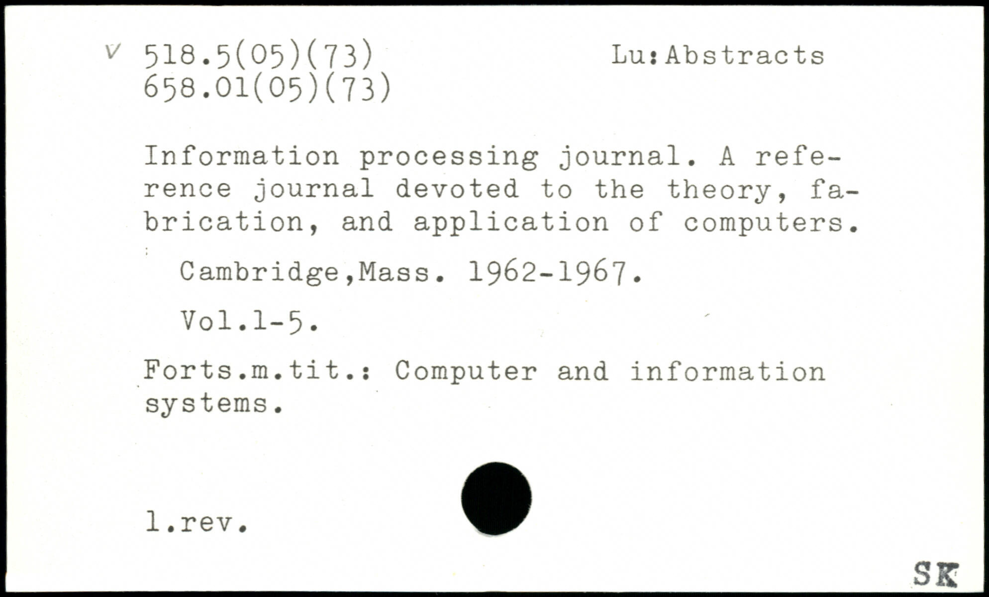 Information processing journal. A reference journal devoted to the theory, fabrication, and application of computers. Cambridge,Mass. 1962-1967.
