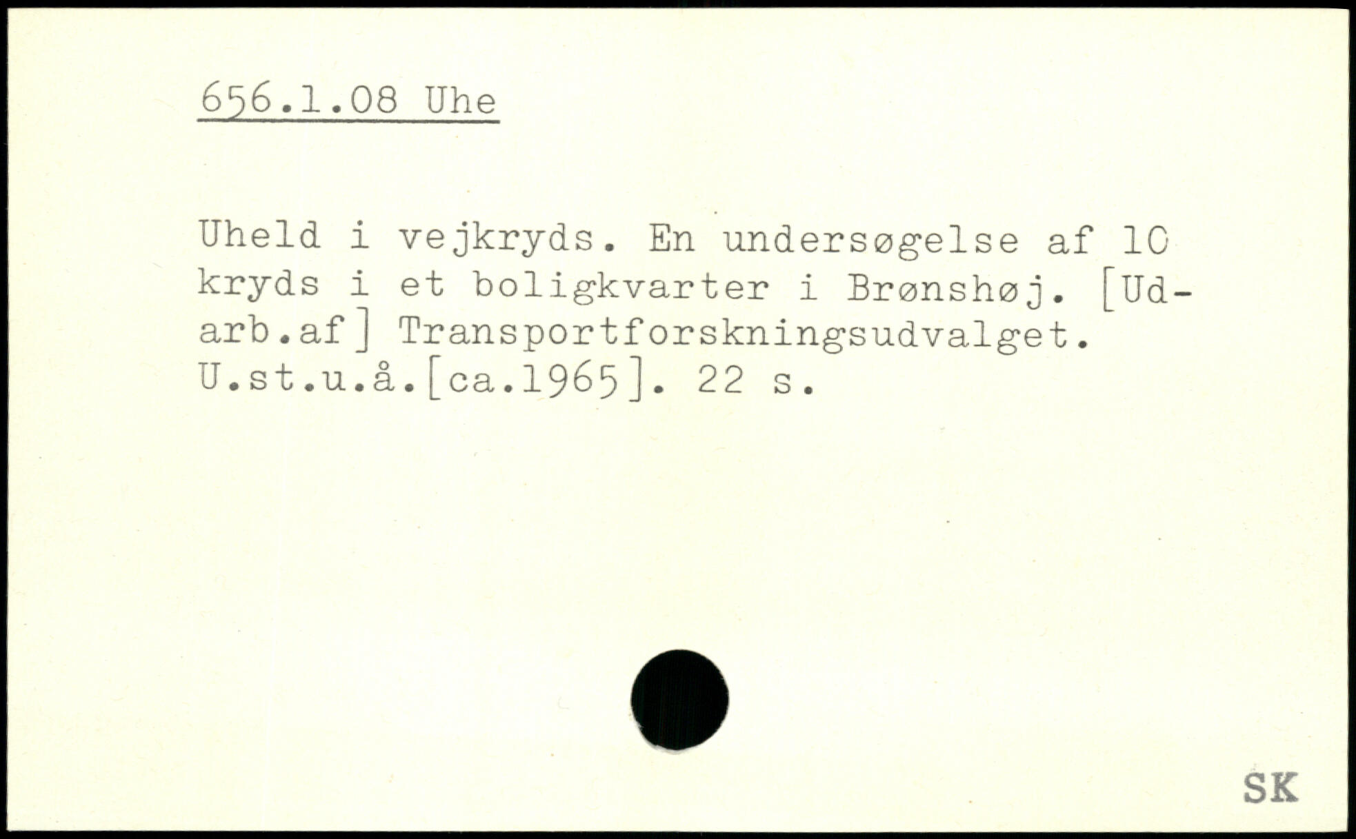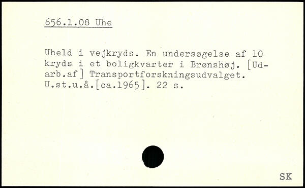 Uheld i vejkryds. En undersøgelse af 10 kryds i et boligkvarter i Brønshøj. [Ud-arb.af] Transportforskningsudvalget. U.st.u.å.[ca.1965].