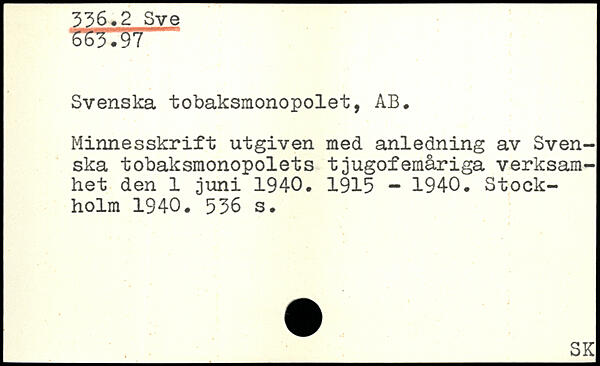 Minnesskrift utgiven med anledning av Svenska tobaksmonopolets tjugofemåriga verksamhet den 1 juni 1940. 1915 - 1940.