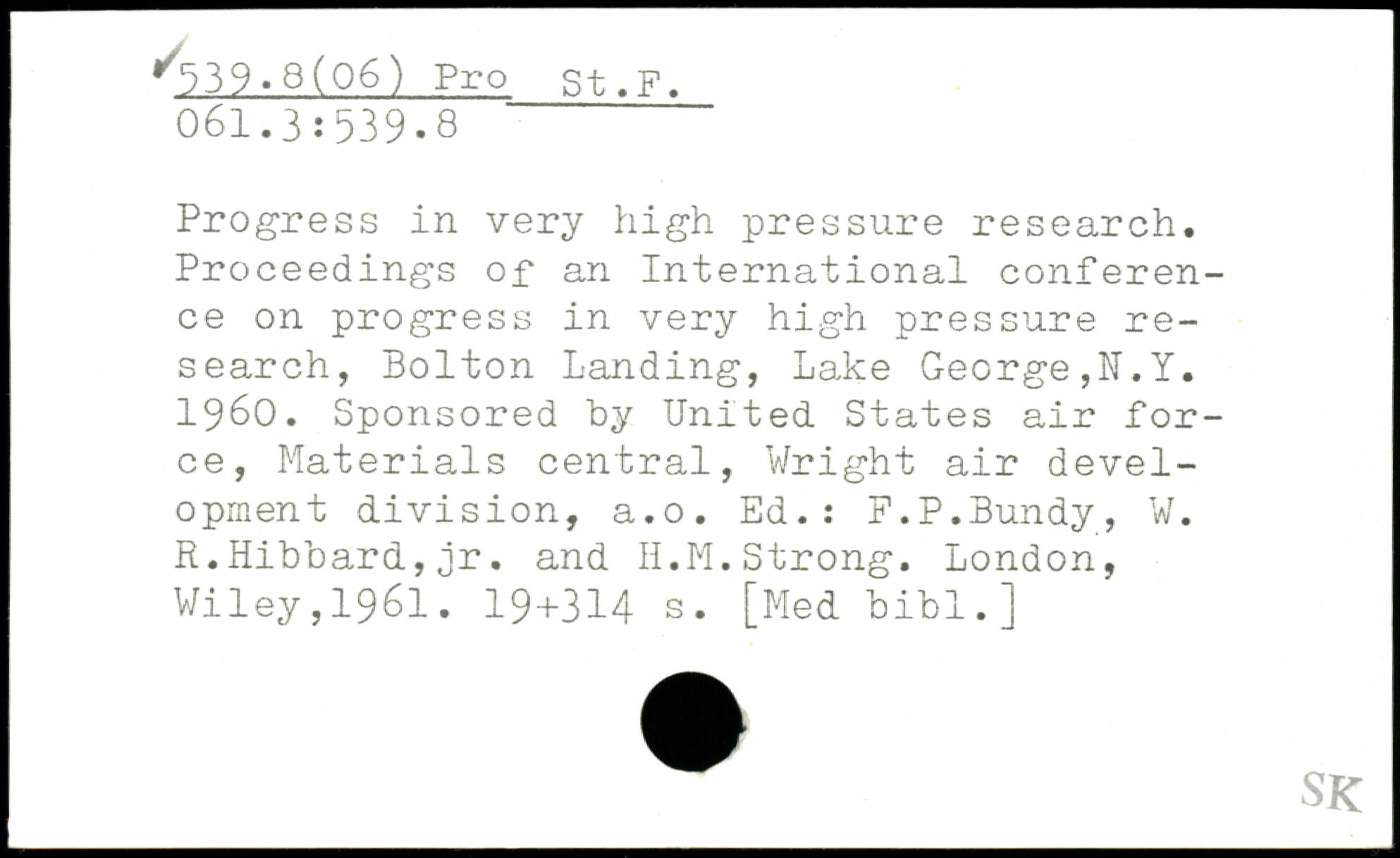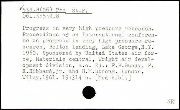 Progress in very high pressure research. Proceedings of an International conference on progress in very high pressure research, Bolton Landing, Lake George,U.Y. 1960. Sponsored by United States air force, Materials central, Wright air development division, a.o. Ed.: P.P.Bundy, W. R.Hibbard,jr. and H.M.Strong.