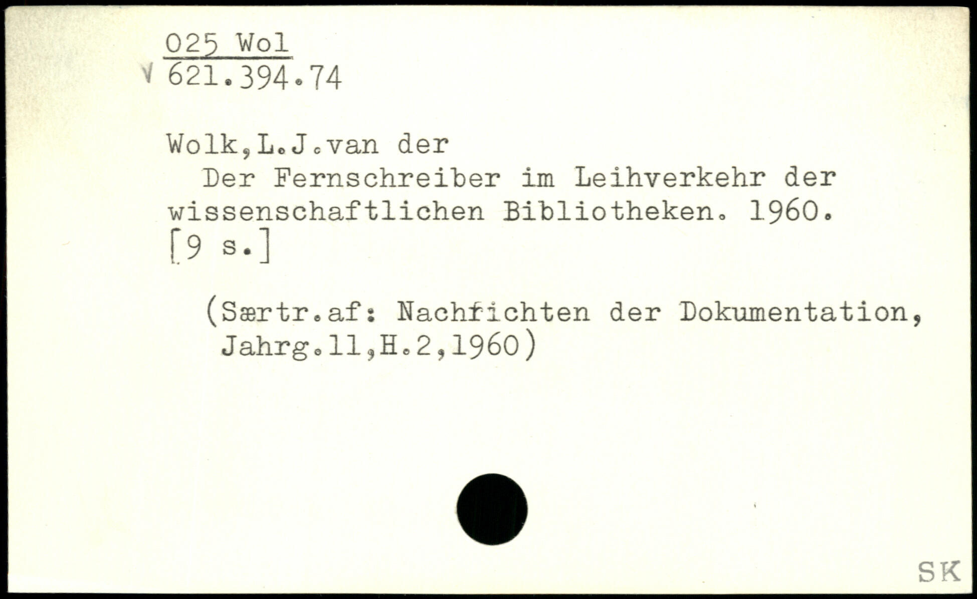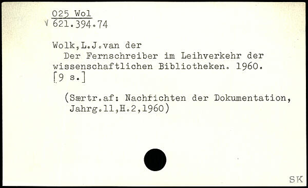 Wolk,L,Jevan der Der Fernschreiber im Leihverkehr der wissenschaftlichen Bibliotheken, 1960.