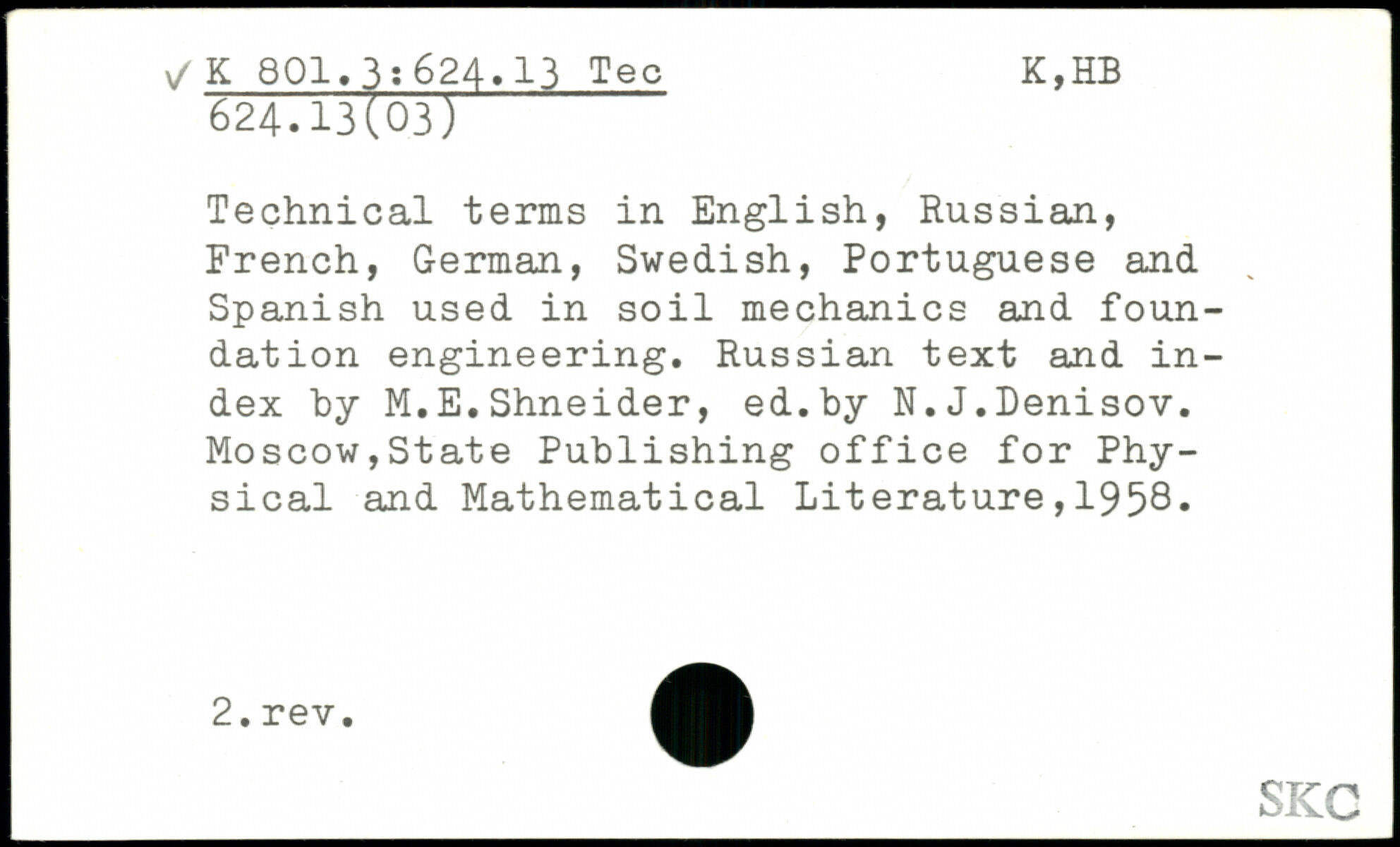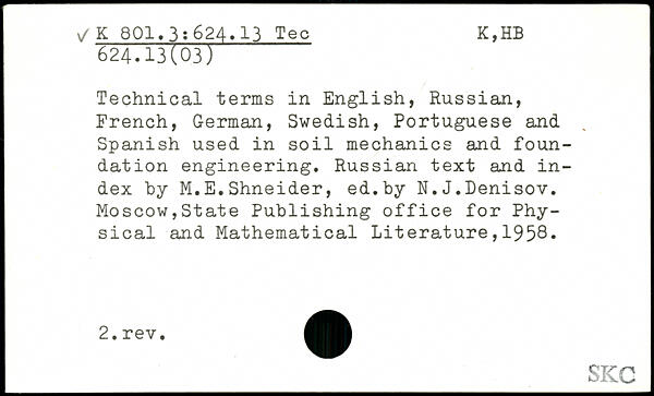 Technical terms in English, Russian, French, German, Swedish, Portuguese and Spanish used in soil mechanics and foundation engineering. Russian text and index by M.E.Shneider, ed.by N.J.Denisov. Moscow,State Publishing office for Physical and Mathematical Literature,1958, _ SICC