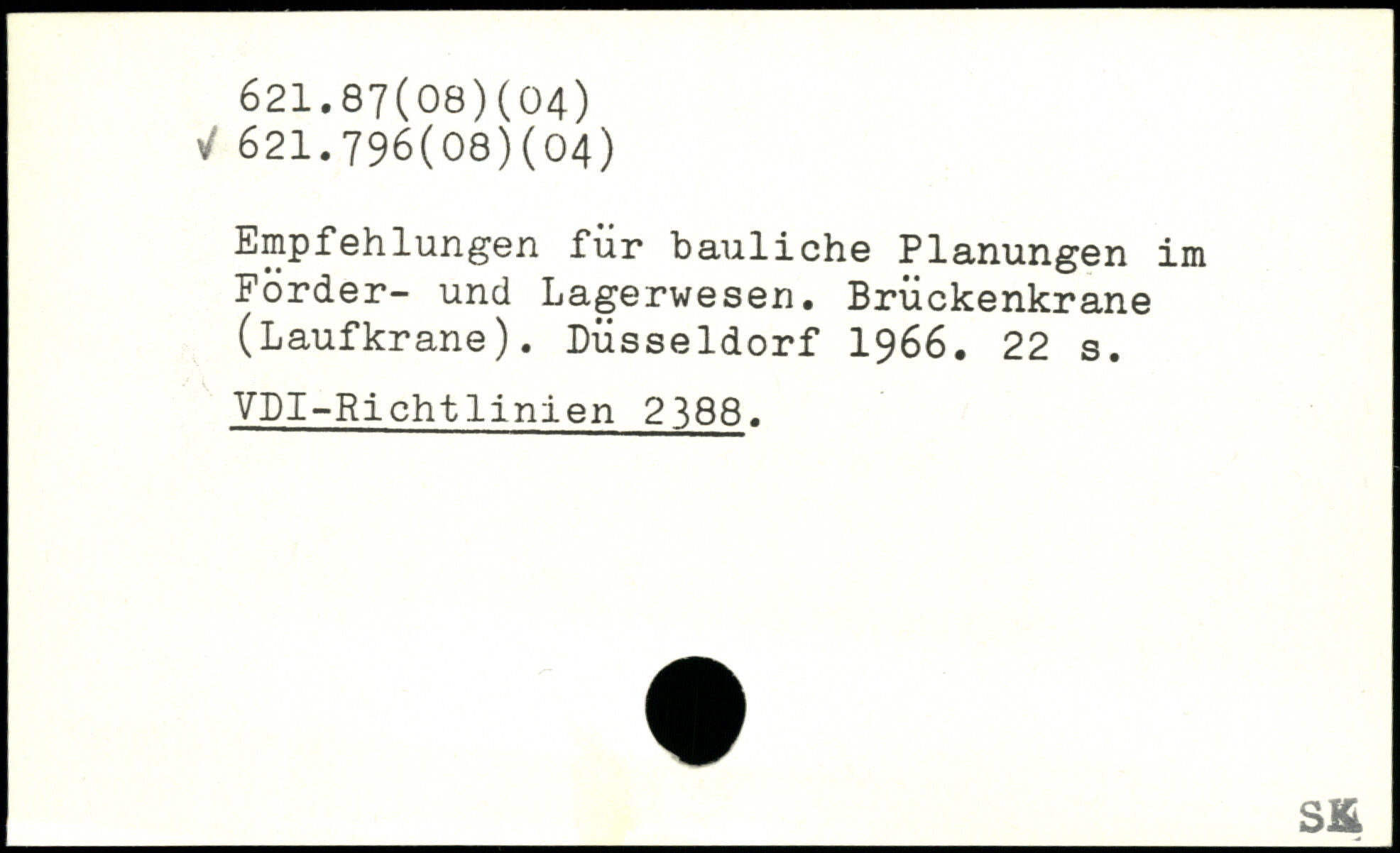 Empfehlungen für bauliche Planungen im Forder- und Lagerwesen. Brückenkrane (Laufkrane). Düsseldorf 1966.