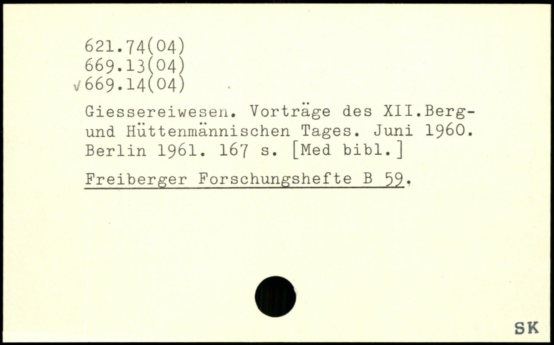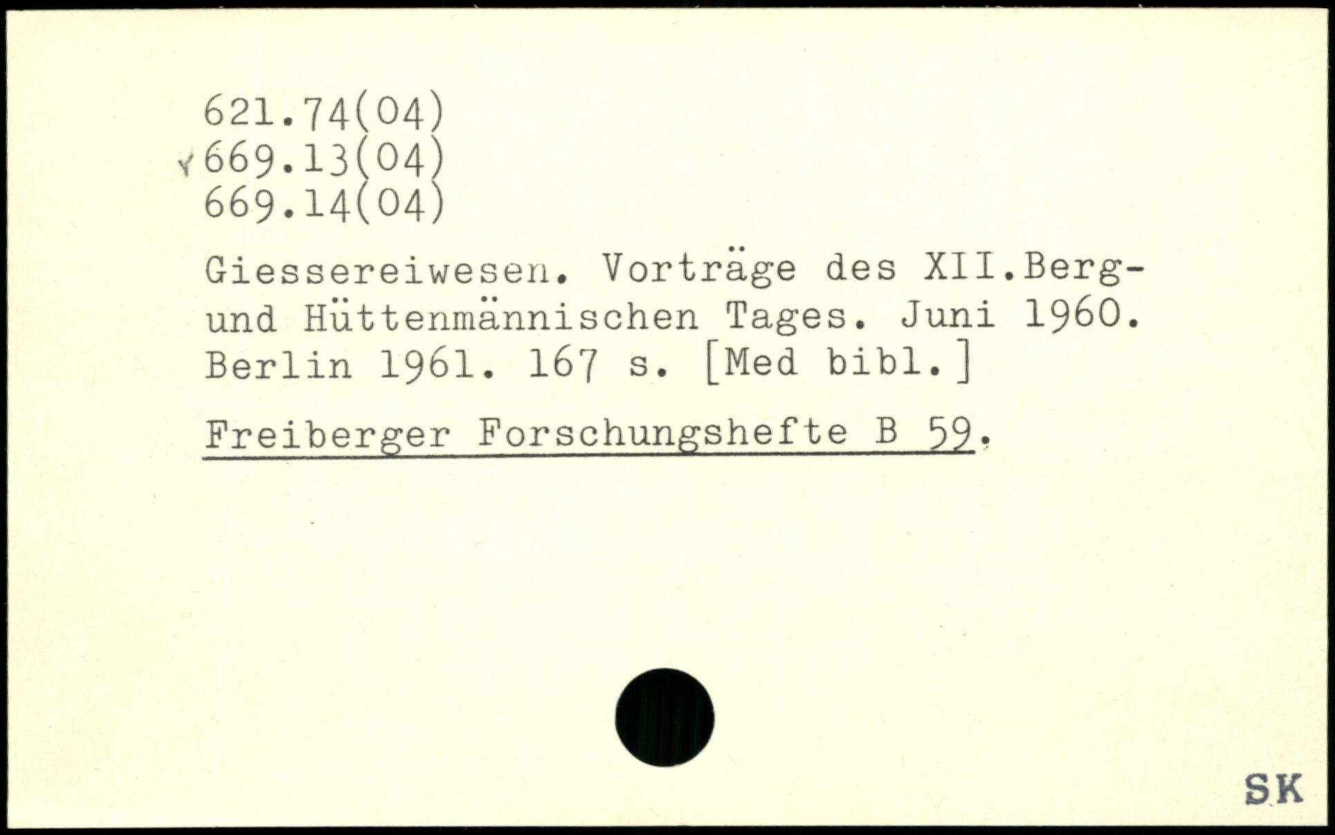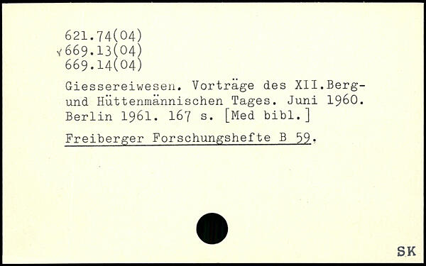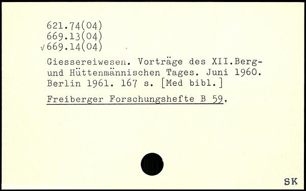 Giessereiwesen. Vortrage des XII.Berg-und Huttenmannischen Tages. Juni 1960.