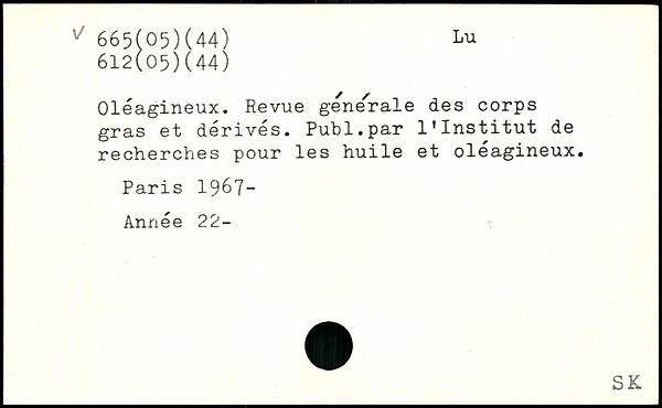 Oléagineux. Revue generale des corps gras et dérivés. Publ.par l'Institut de recherches pour les huile et oléagineux.