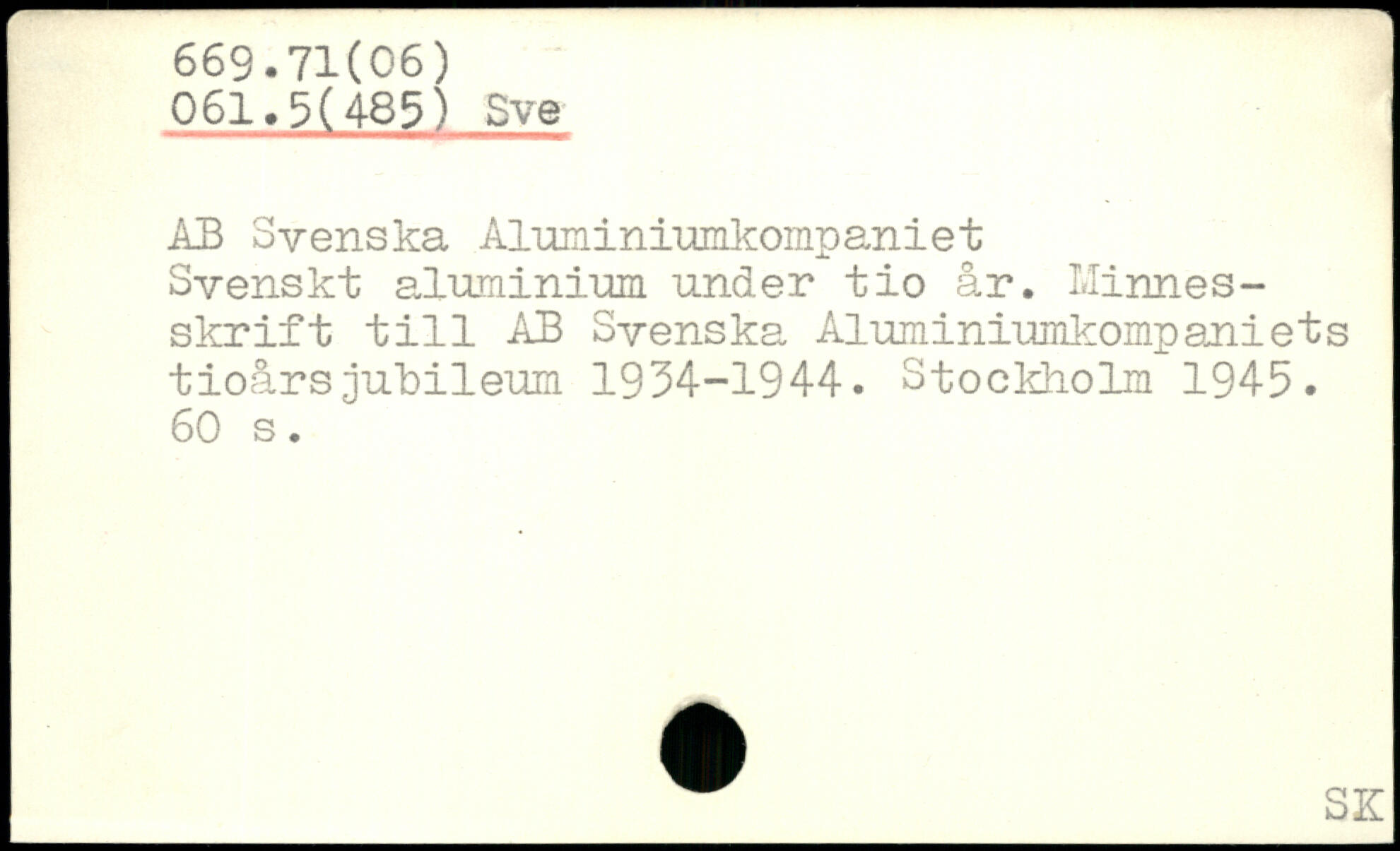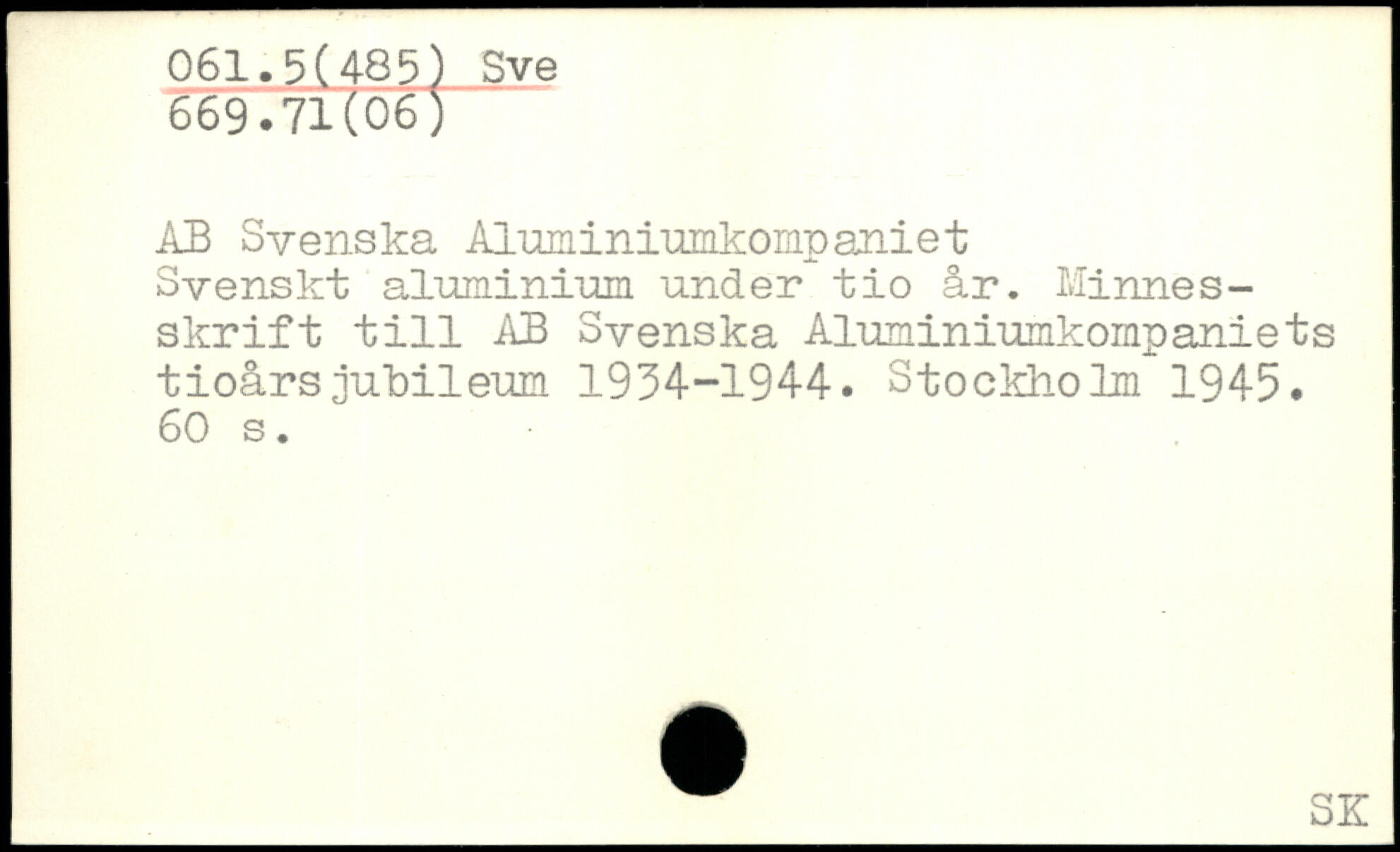 AB Svenska Aluminiumkompaniet Svenskt aluminium under tio år. Minnesskrift till AB Svenska Aluminiumkompaniets tioårsjubileum 1934-1944.