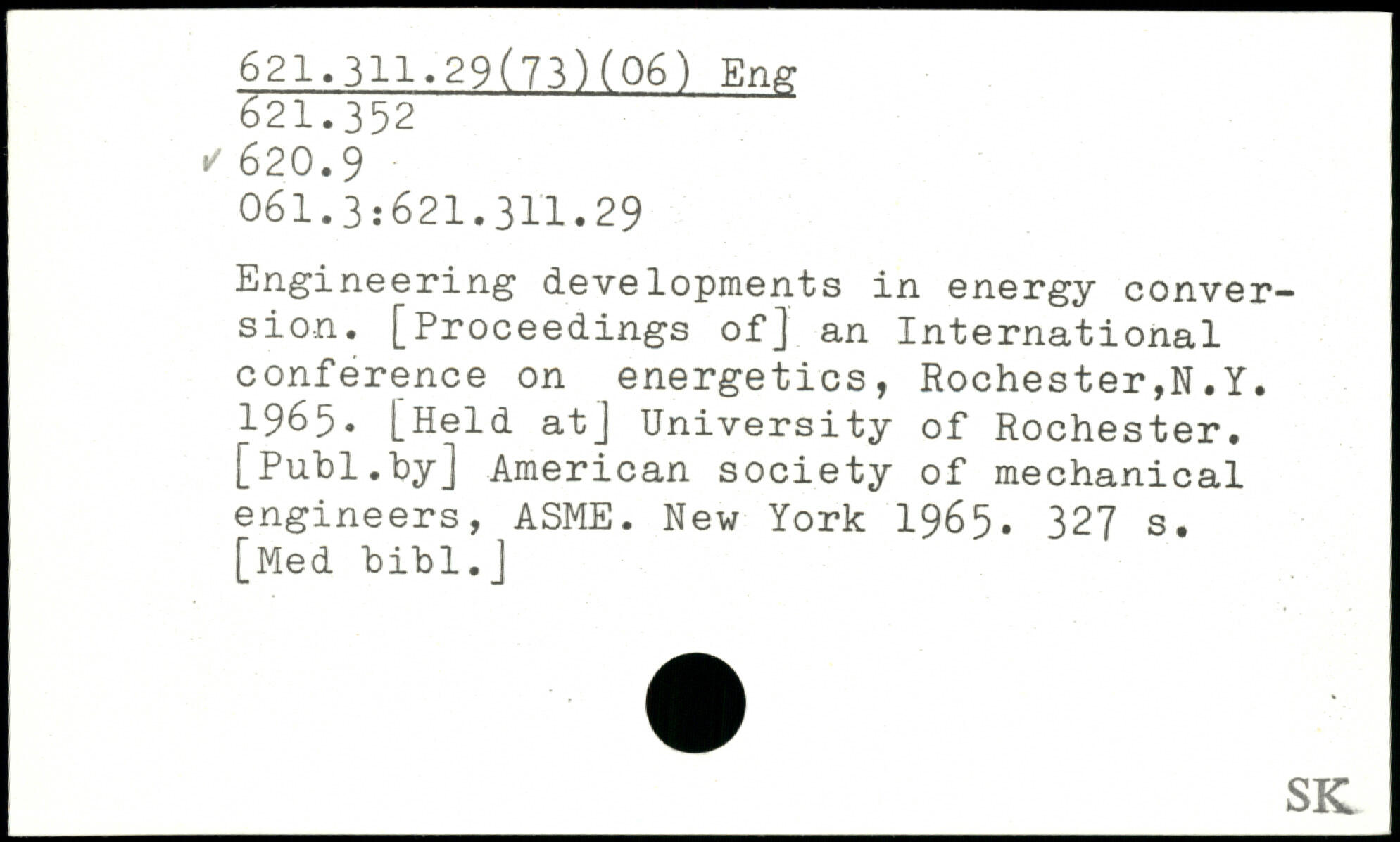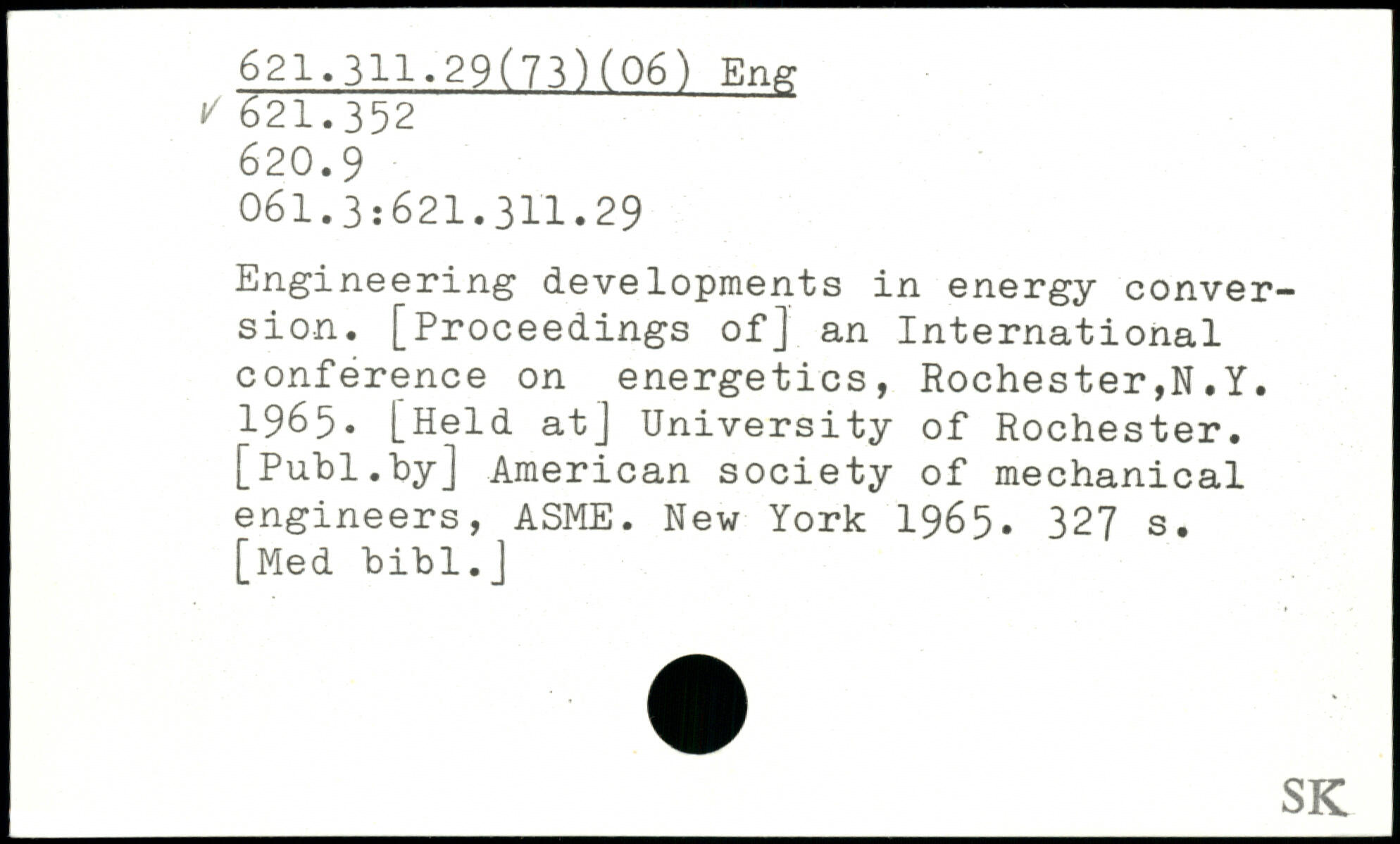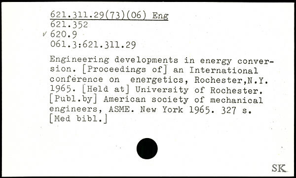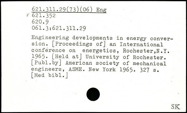 Engineering developments in energy conversion. [Proceedings of] an International conference on energetics, Rochester,N.Y. 1965. [Held at] University of Rochester. [Publ.hy] American society of mechanical engineers, ASME.
