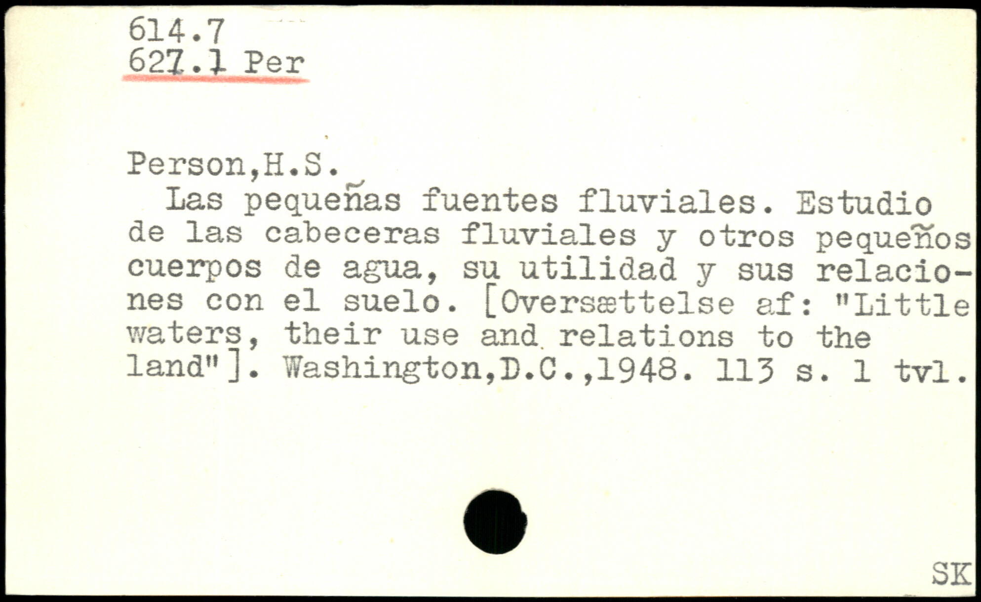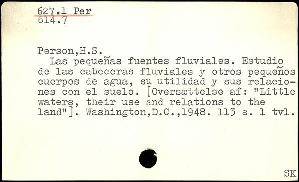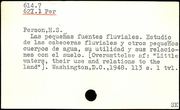Las pequenas fuentes fluviales. Estudio de las cabeceras fluviales y otros pequenos euerpos de agua, su utilidad y sus relacio-nes con el suelo. [Oversættelse af: ”Little waters, their use and. relations to the land”].