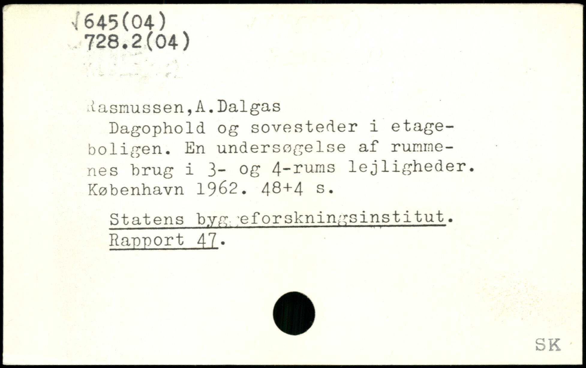 Rasmussen,A.Dalgas Dagophold og sovesteder i etageboligen. En undersøgelse af rummenes brug i 3- og 4-rums lejligheder. København 19&2.