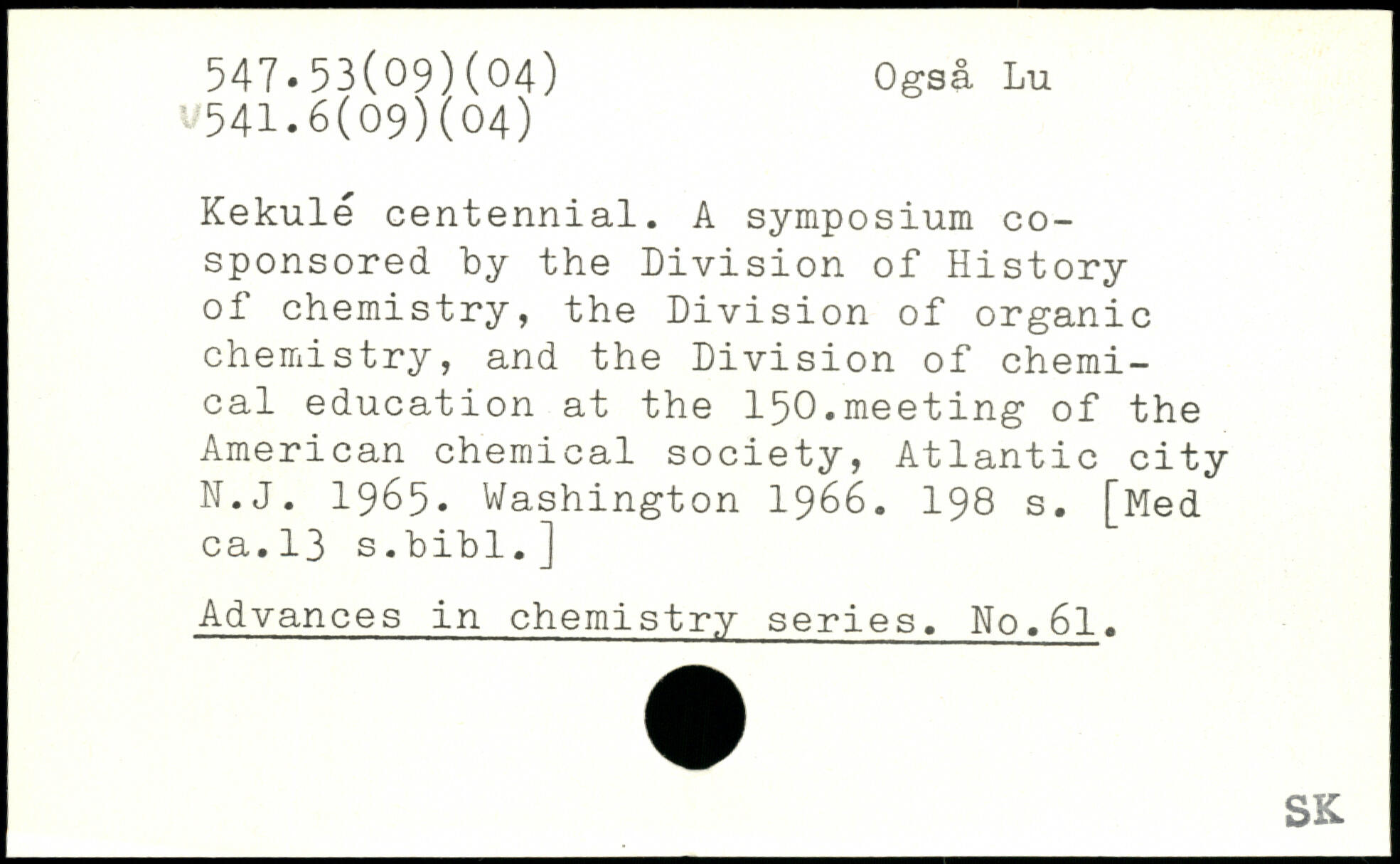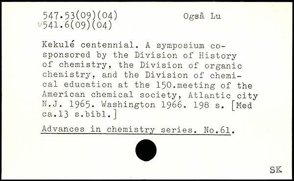 Kekule centennial. A symposium cosponsored by the Division of History of chemistry, the Division of organic chemistry, and the Division of chemical education at the 150.meeting of the American chemical society, Atlantic city N.J. 1965.