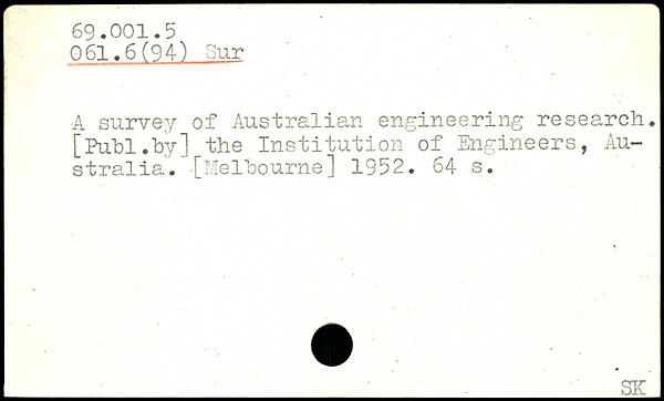 A survey of Australian engineering research. [Puhl.by] the Institution of Engineers, Australia. [Melbourne] 1952.