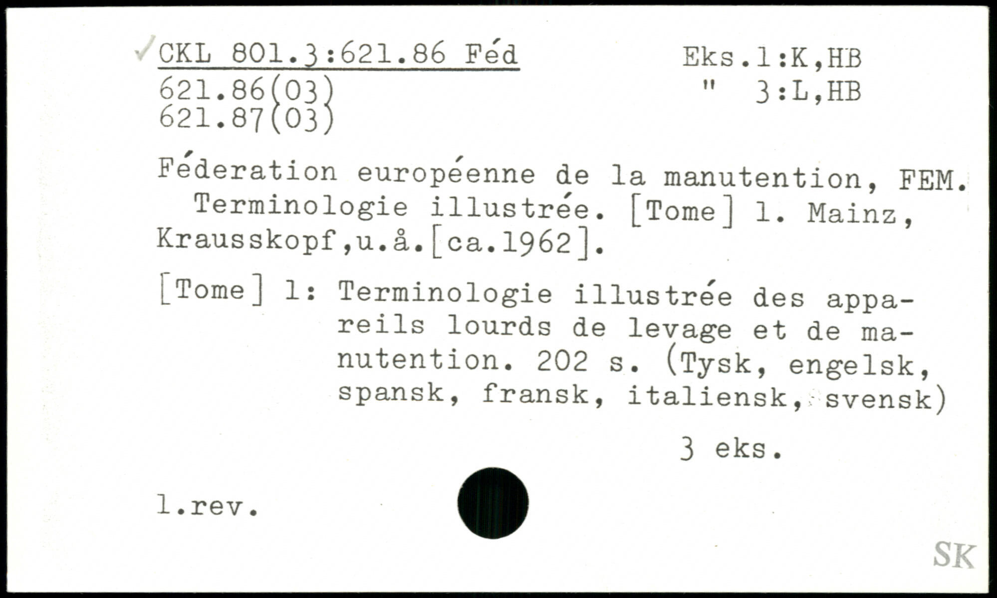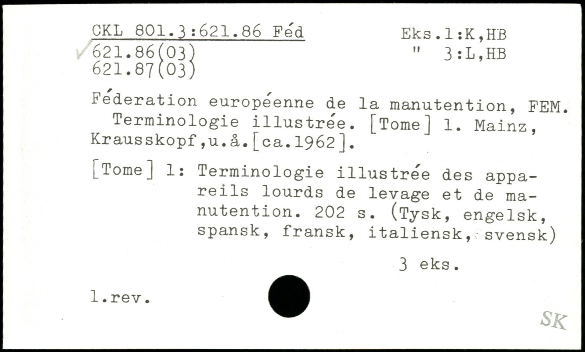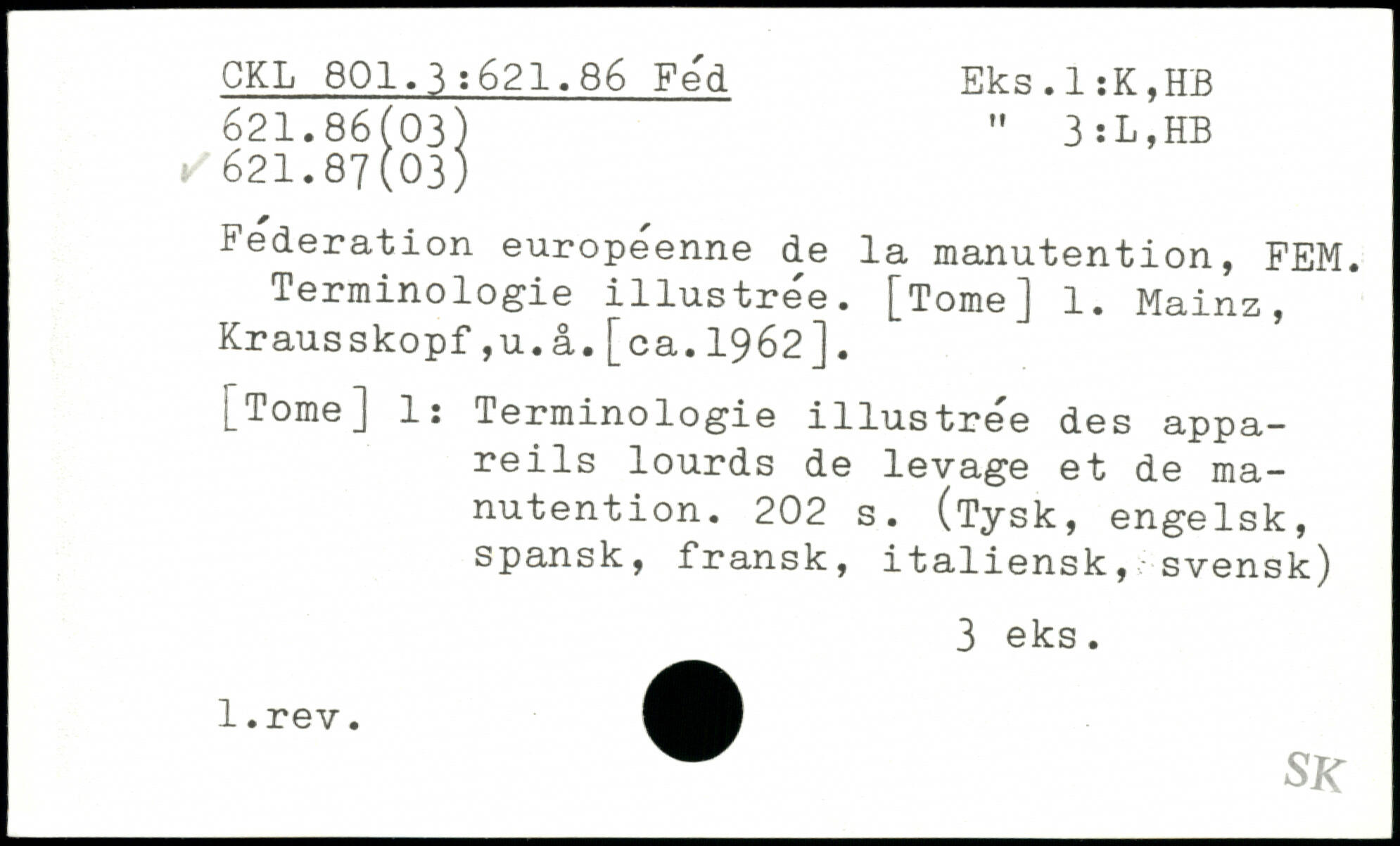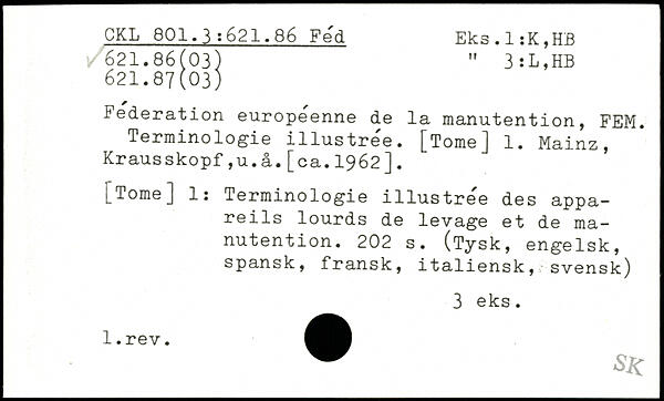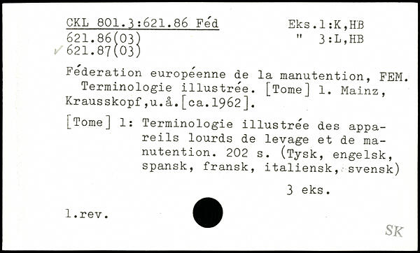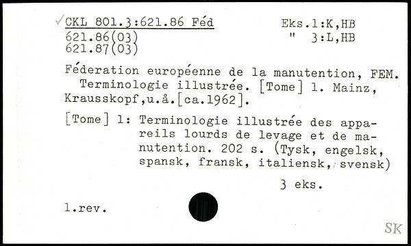 Federation européenne de la manutention, FEM. Terminologie illustrée. [TomeJ 1. Mainz, Krausskopf,u.â.[ca.1962].