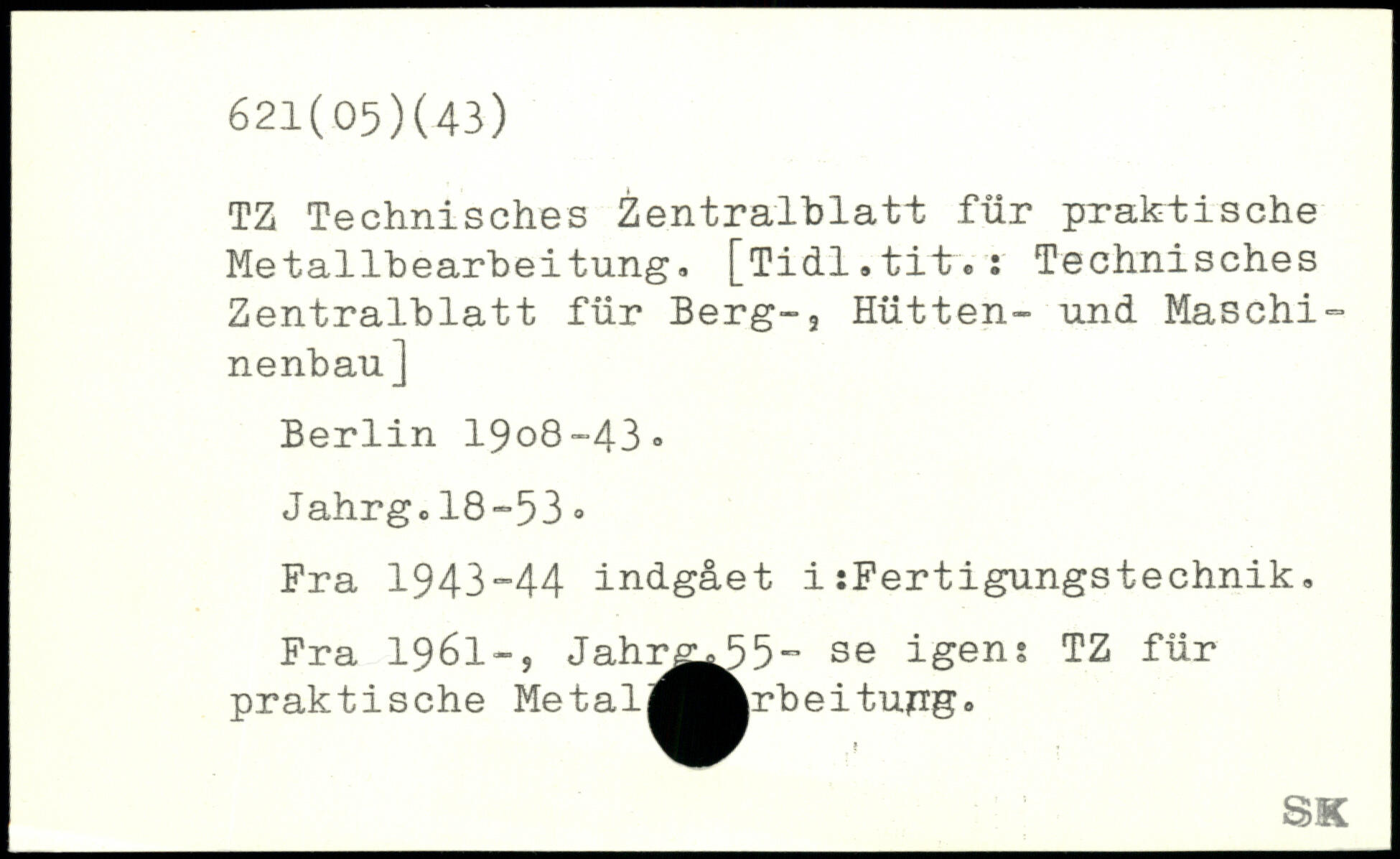TZ Technisches Zentralblatt für praktische Metallbearbeitung. [Tidl.tit.: Technisches Zentralblatt für Berg-3 Hütten- und Maschinenbau] Berlin 19o8~43. Jahrg.18-53. Pra 1943-44 indgået i :Pertigungstechnik. Fra 1961-, Jah^^5- se igen; TZ für praktische Metal^^^rbeitujng.