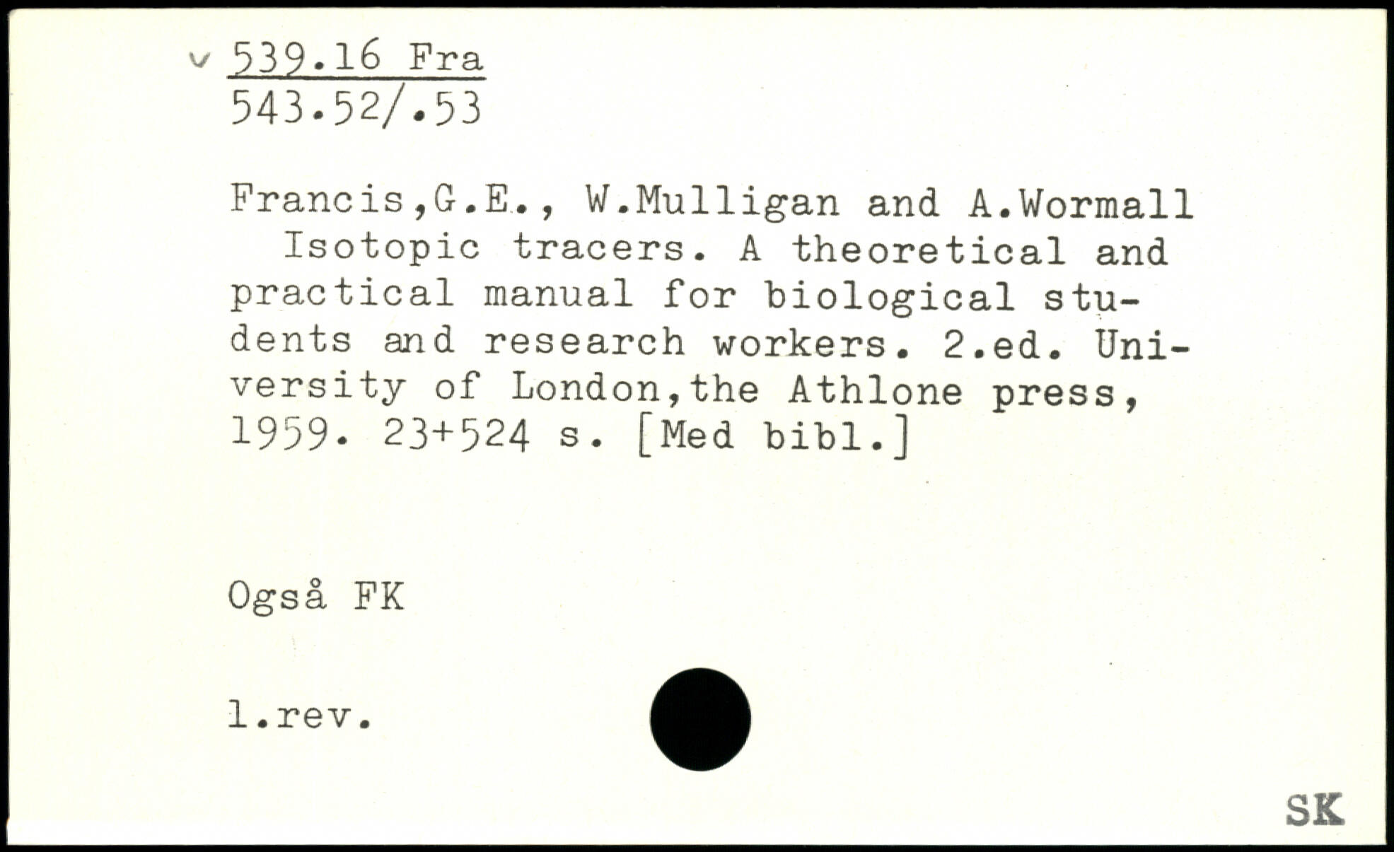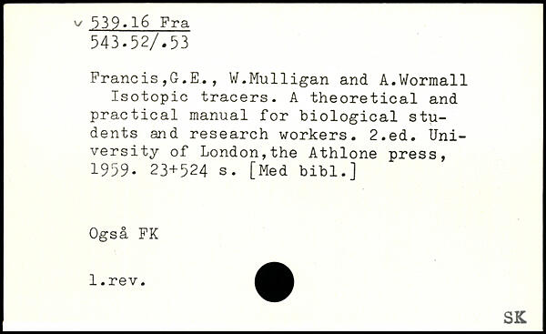 Francis,G.E., W.Mulligan and A.Wormall Isotopic tracers. A theoretical and practical manual for biological students and research workers.