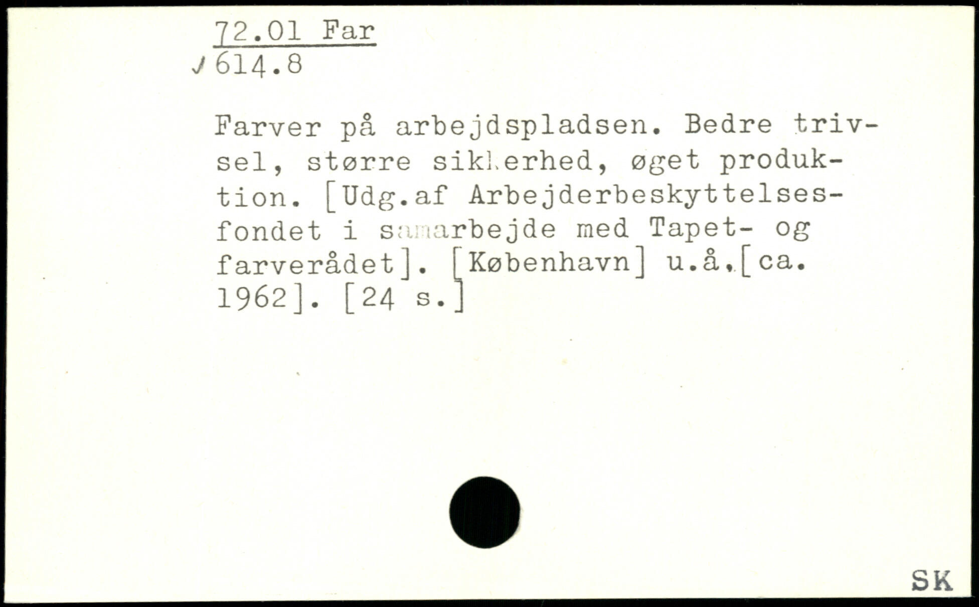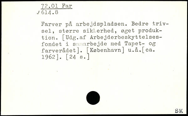 Farver på arbejdspladsen. Bedre trivsel, større sik].erhed, øget produktion. [Udg.af Arbejderbeskyttelsesfondet i sariarbejde med Tapet- og farverådet]. [København] u.å,[ca. 1962]. [