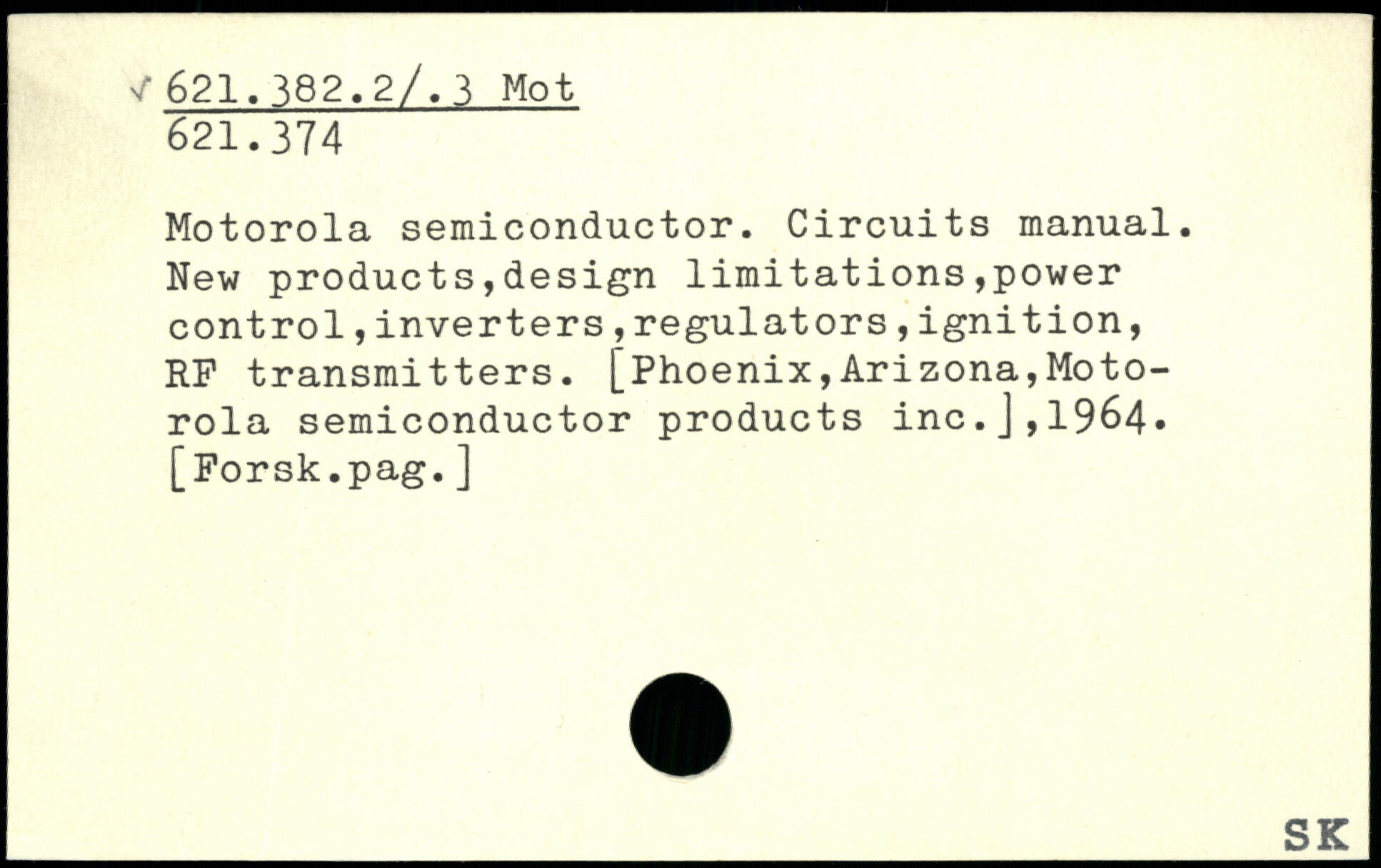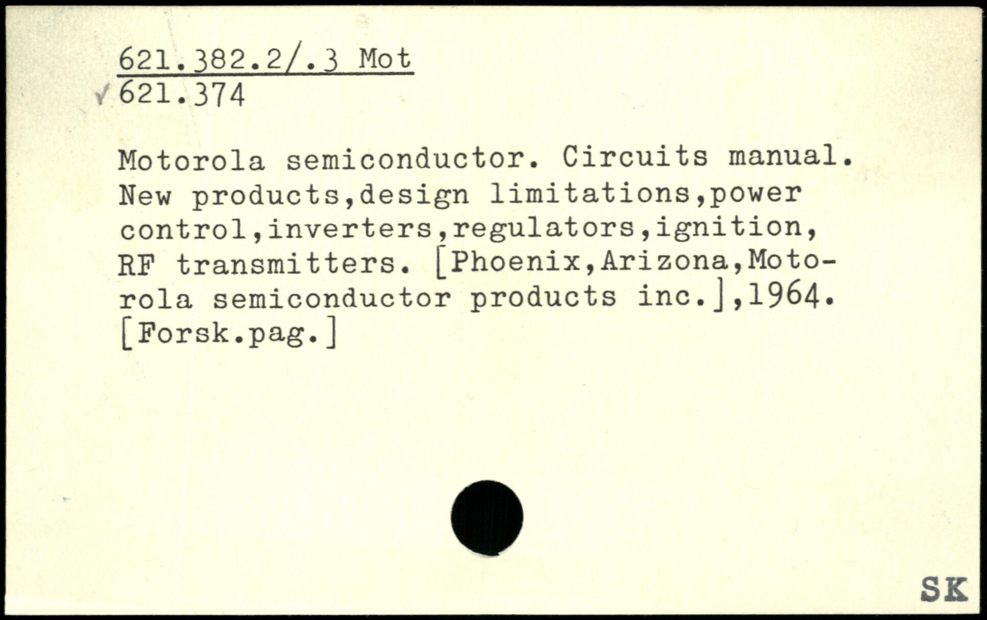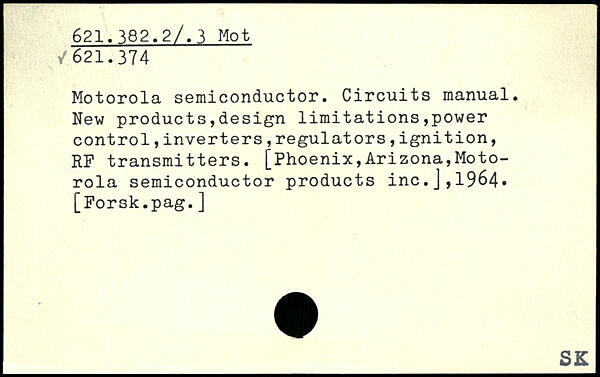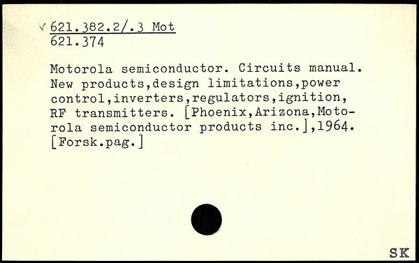 Motorola semiconductor. Circuits manual. New products,design limitations,power control,inverters,regulators,ignition, RF transmitters. [Phoenix,Arizona,Motorola semiconductor products inc.],1964, [Forsk.pag.]