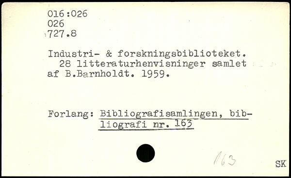 Industri- & forskningsbiblioteket. 28 litteraturhenvisninger samlet af B.Barnholdt. 1959, Forlang: Bibliografisamlingen, bib-1 i ograf i nrTT63_