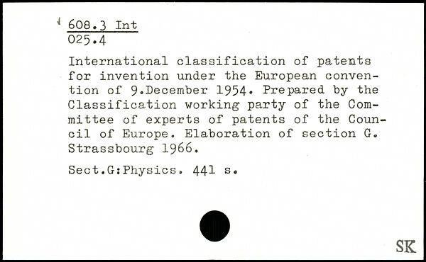 International classification of patents for invention under the European convention of 9.December 1954. Prepared by the Classification working party of the Committee of experts of patents of the Council of Europe. Elaboration of section G. Strassbourg 1966. Sect.GîPhysics.