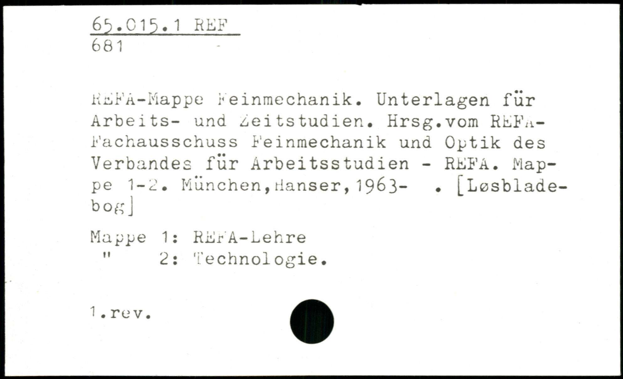 KHFA-Mappe Feinmechanik. Unterlagen für Arbeits- und Zeitstudien. Hrsg.vom RHFn-Fachausschuss Feinmechanik und Optik des Verbandes für Arbeitsstudien - RKFA. Mappe 1-2. München,danser,1963-. [Løsblade bog J Mappe 1: RKFA-Lehre " 2: Technologie.