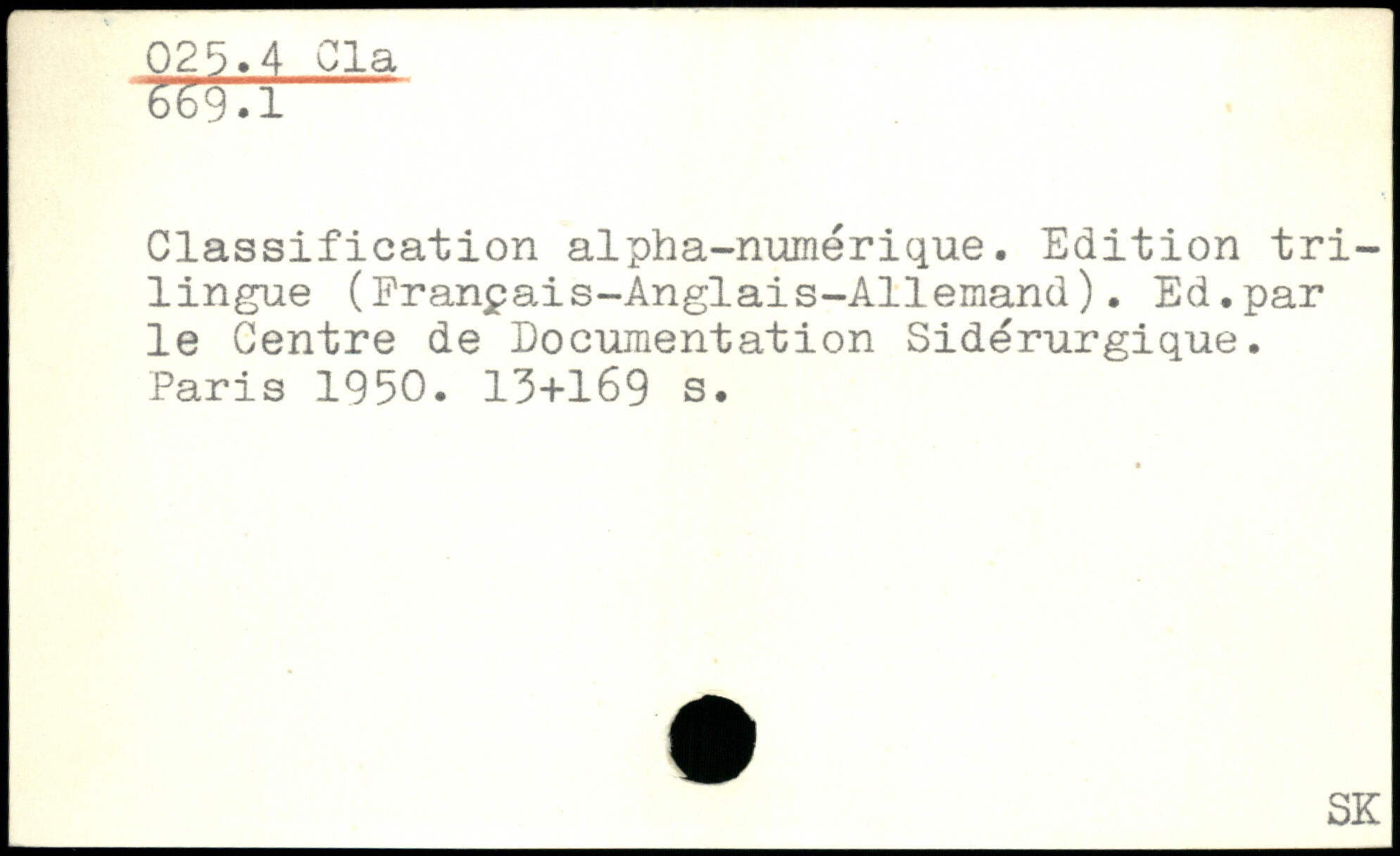 Classification alpha-numérique. Edition trilingue (Franpais-Anglais-Allemand). Ed.par le Centre de Documentation Sidérurgique.