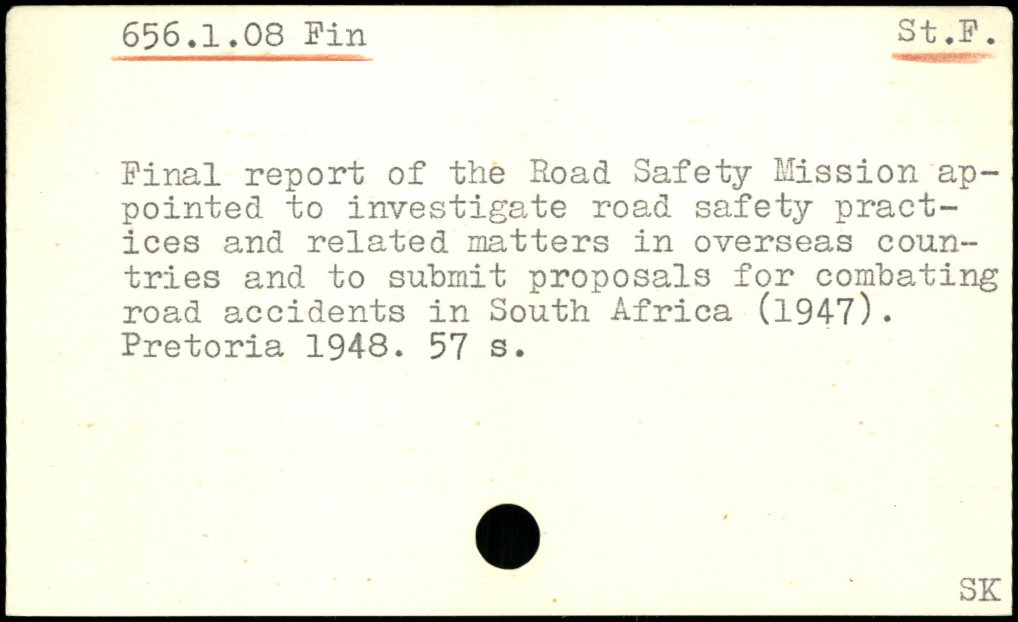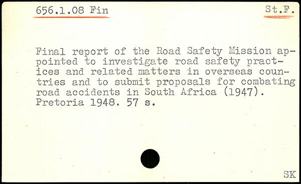 Final report of the Road Safety Mission appointed to investigate road safety practices and related matters in overseas countries and to submit proposals for combating road accidents in South Africa (1947). Pretoria 1948.