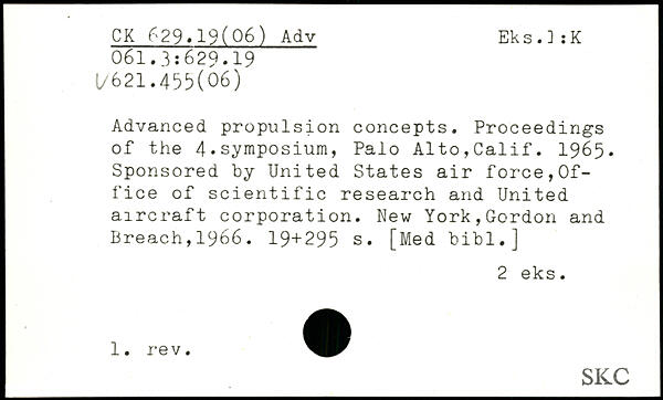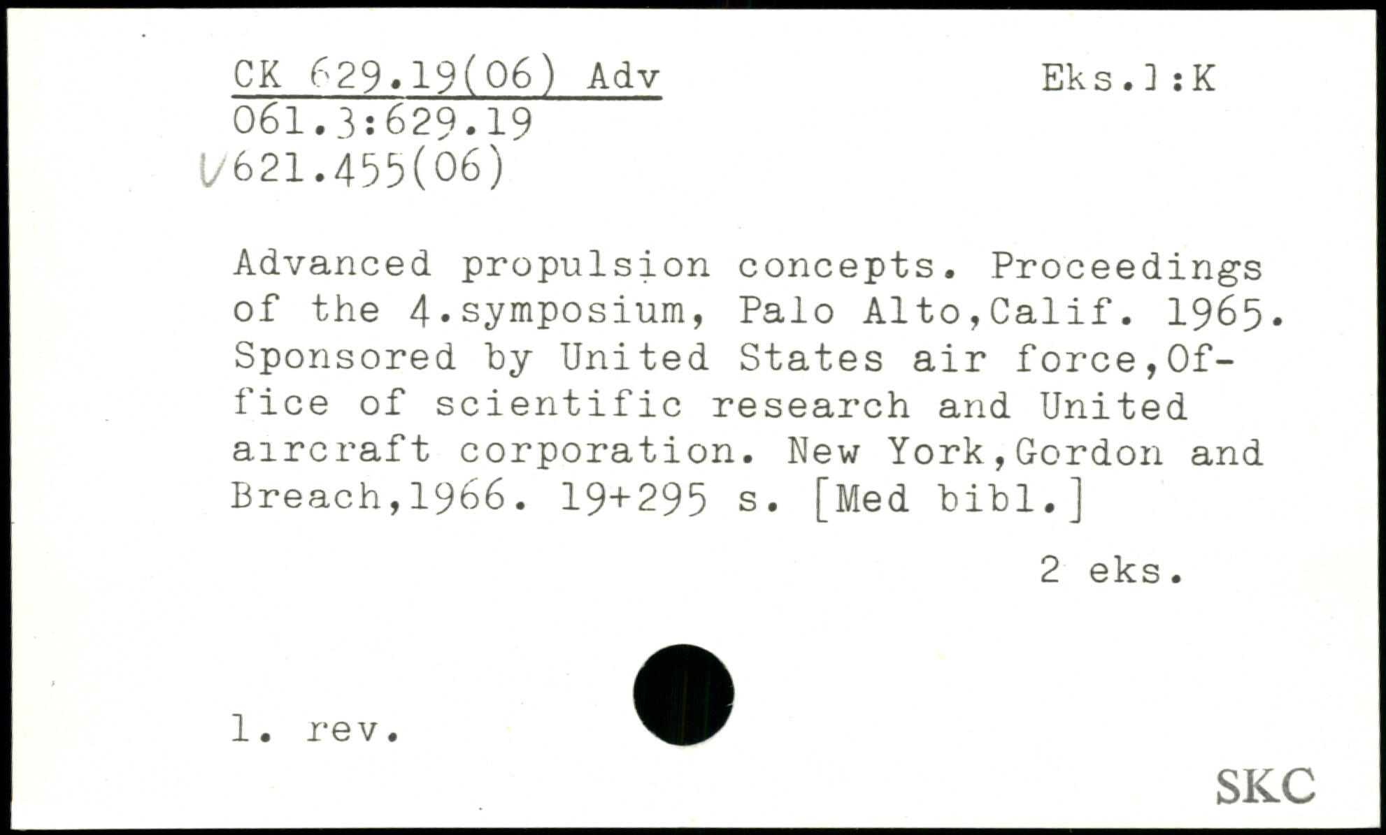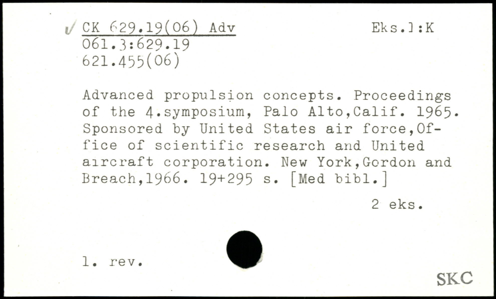 Advanced propulsion concepts. Proceedings of the 4,symposium, Palo Alto,Calif. 1965. Sponsored by United States air force,Office of scientific research and United aircraft corporation.