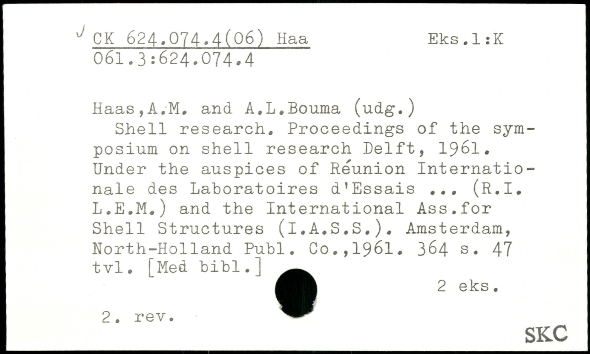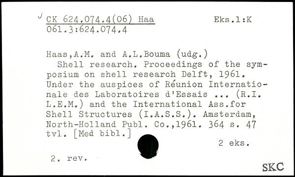 Shell research. Proceedings of the symposium on shell research Delft, 1961. Under the auspices of Reunion Internationale des Laboratoires d'Essais ... (R.I. L.E.M.) and the International Ass.for Shell Structures (i.A.S.S.). Amsterdam, North-Holland Publ. Co.,1961.