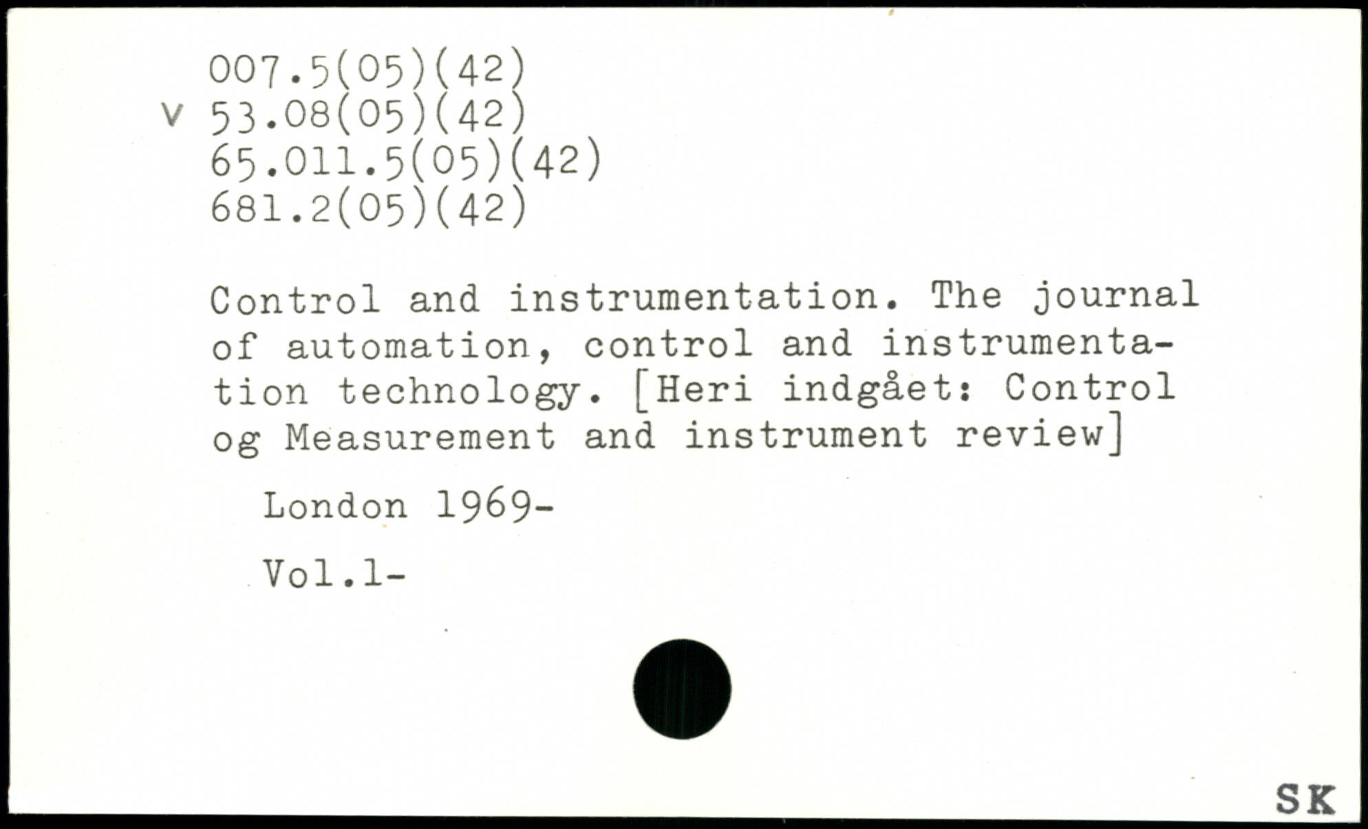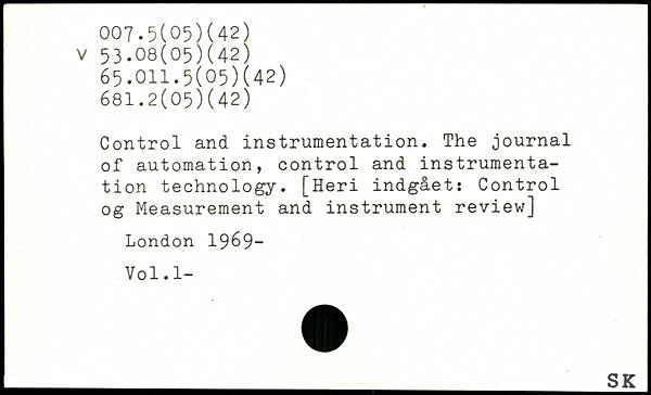 Control and instrumentation. The journal of automation, control and instrumentation technology. [Heri indgået: Control og Measurement and instrument review] London 19&9- Vol.l-