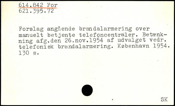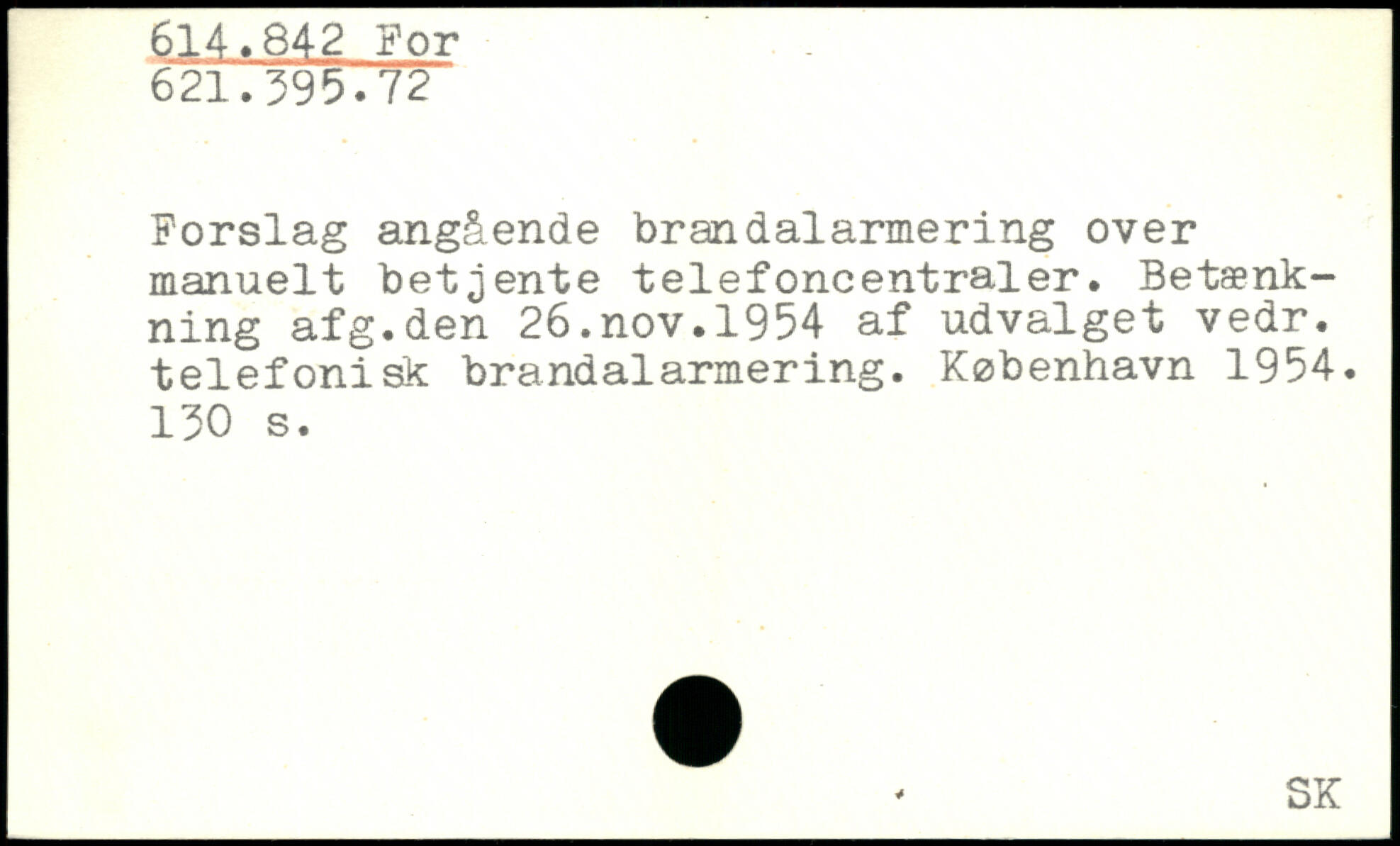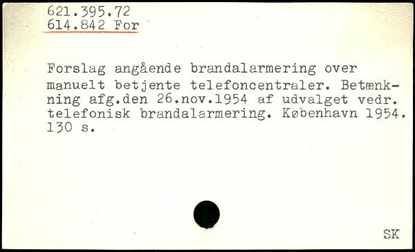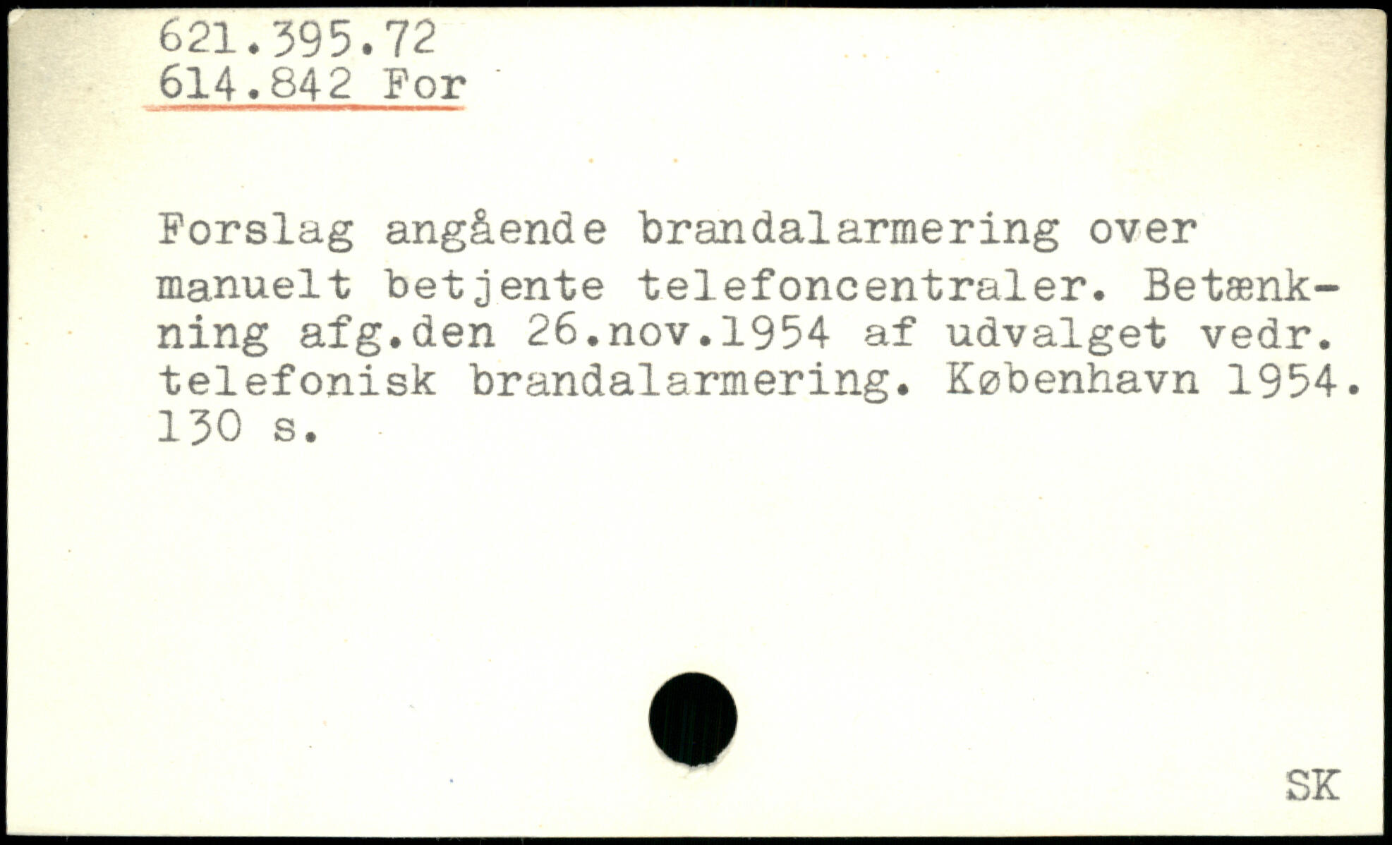 Forslag angående brandalarmering over manuelt betjente telefoncentraler. Betænkning afg.den 26.nov.1954 af udvalget vedr. telefonisk brandalarmering.