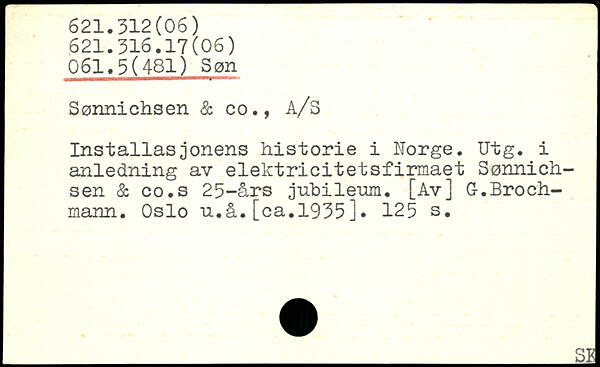 Sonnichsen & co., A/S Installasjonens historié i Norge. Utg. i anledning av elektricitetsfirmaet Sonnich-sen & co.s 25-ârs j-ubilenm. [Av] G-.Broch-mann. Oslo n.â.[ca.1935].